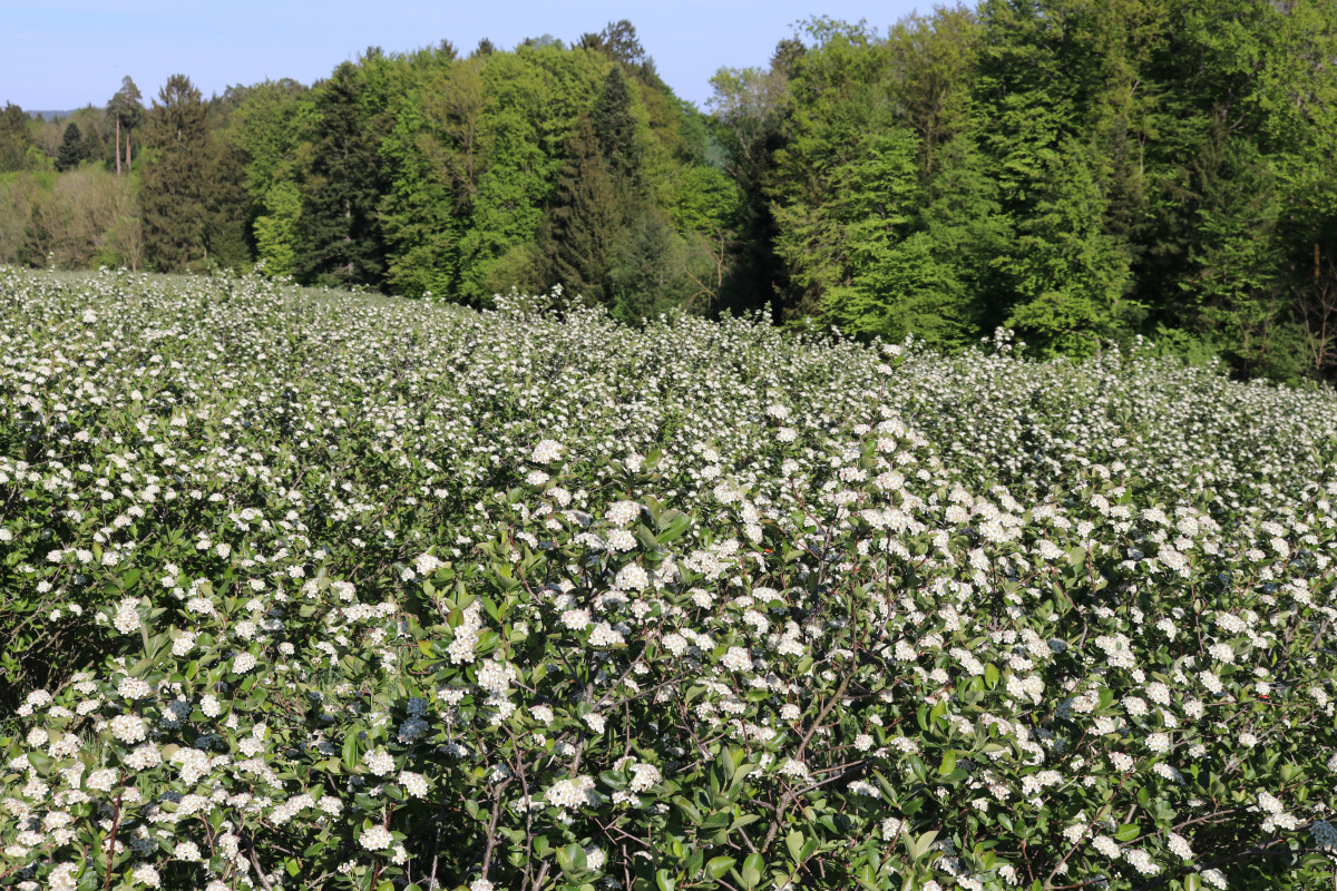 Die Familie Hüttinger hat ihren Betrieb über die Zeit vom klassischen landwirtschaftlichen Betrieb umgebaut zu einem Obstbaubetrieb mit Aronia-Anbau. Die Aroniabeeren blühen im Frühling als wunderschöne Blütendolde und sind Anlaufstelle für viele Insekten. Zwischen den Reihen findet man bei Familie Hüttinger später auch verschiedene Blühstreifen. Im Sommer reifen dann die unglaublich gesunden Früchte heran. Die Beeren sind reich an vielen verschiedenen Vitaminen. Darunter sind Vitamin C, B2, B6, Folsäure aber auch die sehr wirkungsvollen Flavonoide. Im Herbst färben sich die Sträucher rot und bieten damit einen atemberaubenden Anblick.