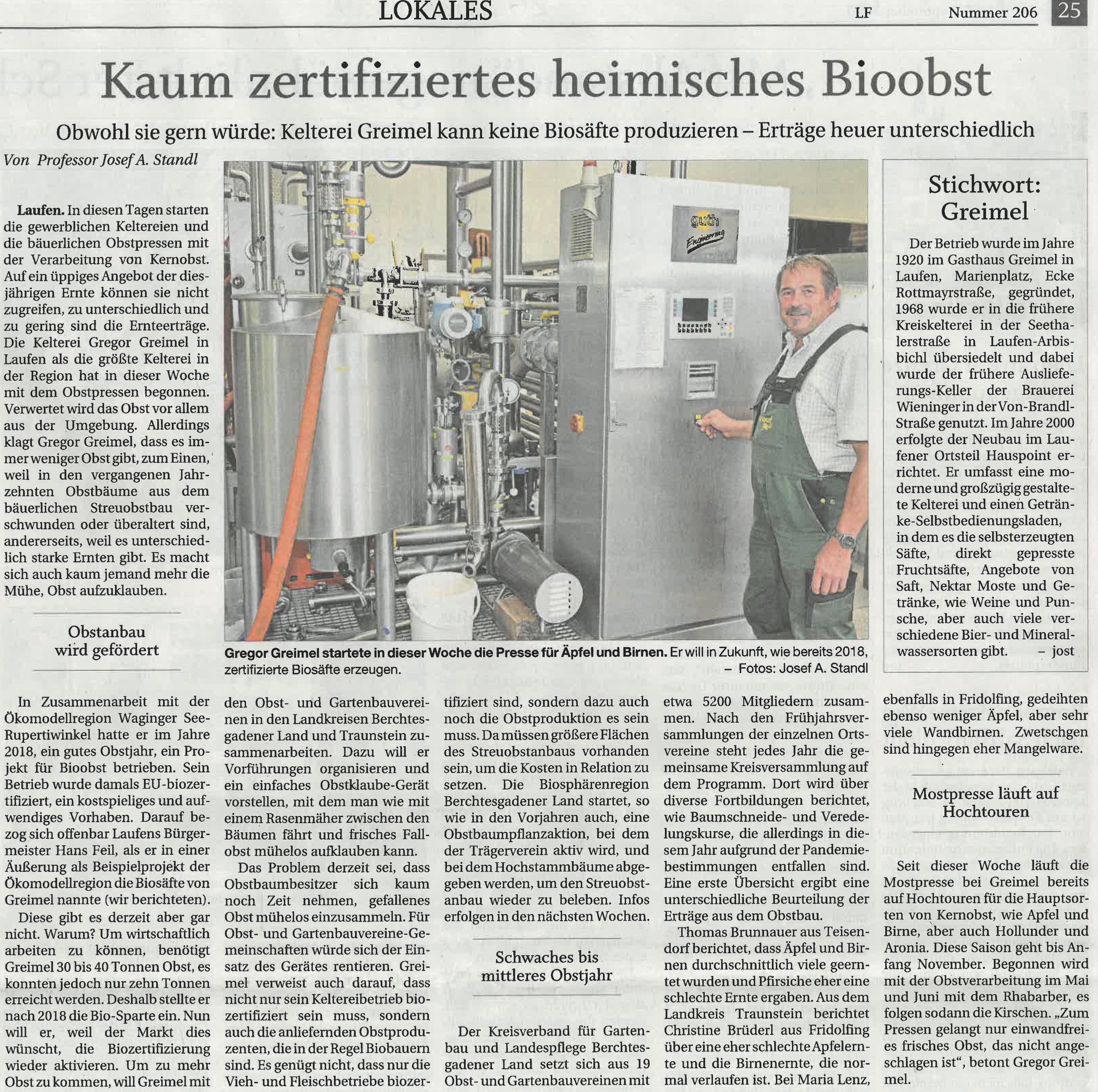 Die Kelterei Gregor Greimel in Laufen als die größte Kelterei in der Region hat in dieser Woche mit dem Obstpressen begonnen. Verwertet wird das Obst vor allem aus der Umgebung. Allerdings klagt Gregor Greimel, dass es immer weniger Obst gibt, zum einen, weil in den vergangenen Jahrzehnten Obstbäume aus dem bäuerlichen Streuobstbau verschwunden oder überaltert sind, andererseits, weil es unterschiedlich starke Ernten gibt. Es macht sich auch kaum jemand mehr die Mühe, Obst aufzuklauben.