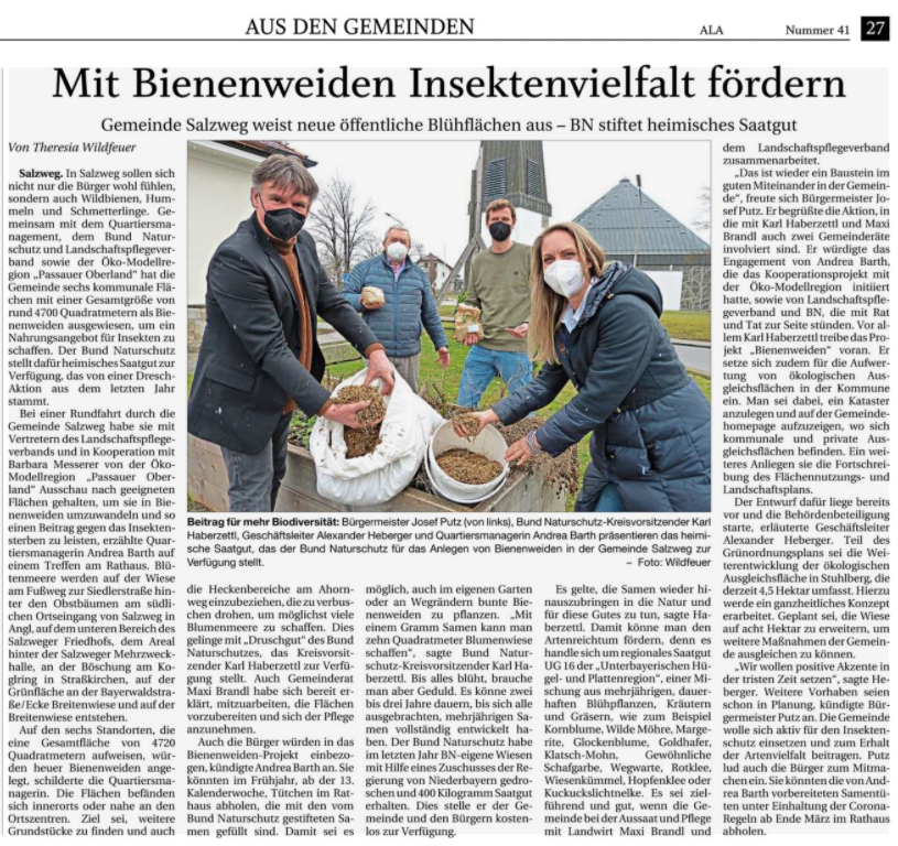 Vom Bund Naturschutz wurden im vergangenen Jahr mit einem Zuschuss der Regierung von Niederbayern eigene, artenreiche Wiesen gedroschen. Das Druschgut konnte wiederum der Gemeinde Salzweg zur Verfügung gestellt werden, um den Artenreichtum im Gemeindegebiet zu fördern. Für die Aussaat und Pflege der Flächen mit Maxi Brand, einem ortsansässigen Landwirt und Mitglied im Gemeinderat, sowie mit dem Landschaftspflegeverband zusammengearbeitet.