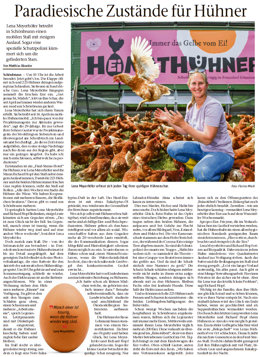 230 Hühnerladies gackern nun fröhlich auf den Wiesen in und um Schönbrunn und erfreuen die Kundschaft mit leckeren Eiern.