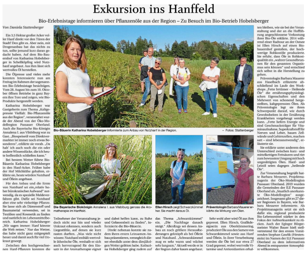 Katharina Hobelsberger wiederum stellt kaltgepresstes Hanföl her, die Ölmühle können wir direkt vor Ort besichtigen.