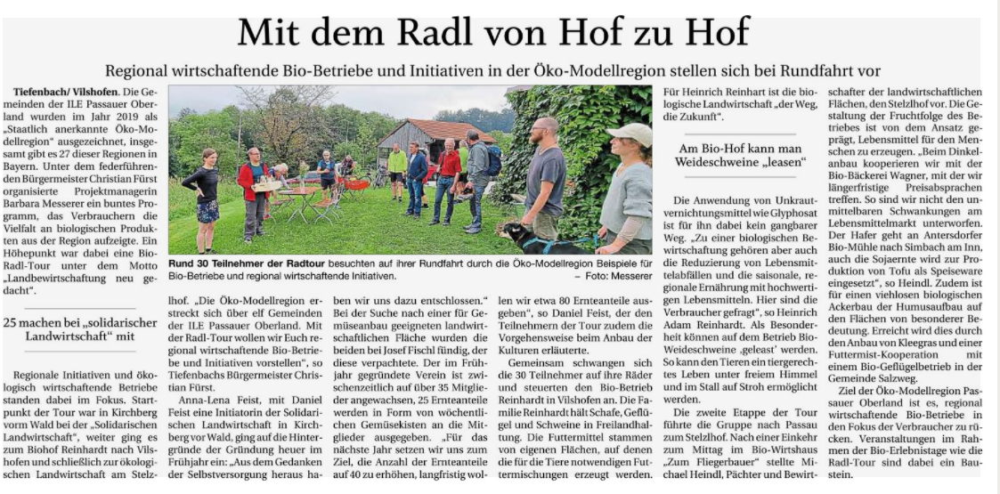 Ziel der Öko-Modellregion Passauer Oberland ist es, regional wirtschaftende Bio-Betriebe in den Fokus der Verbraucherinnen und Verbraucher zu rücken. Veranstaltungen im Rahmen der Bio-Erlebnistage wie die Radl-Tour sind dabei ein Baustein, Bio-Betriebe aus der Region vorzustellen.