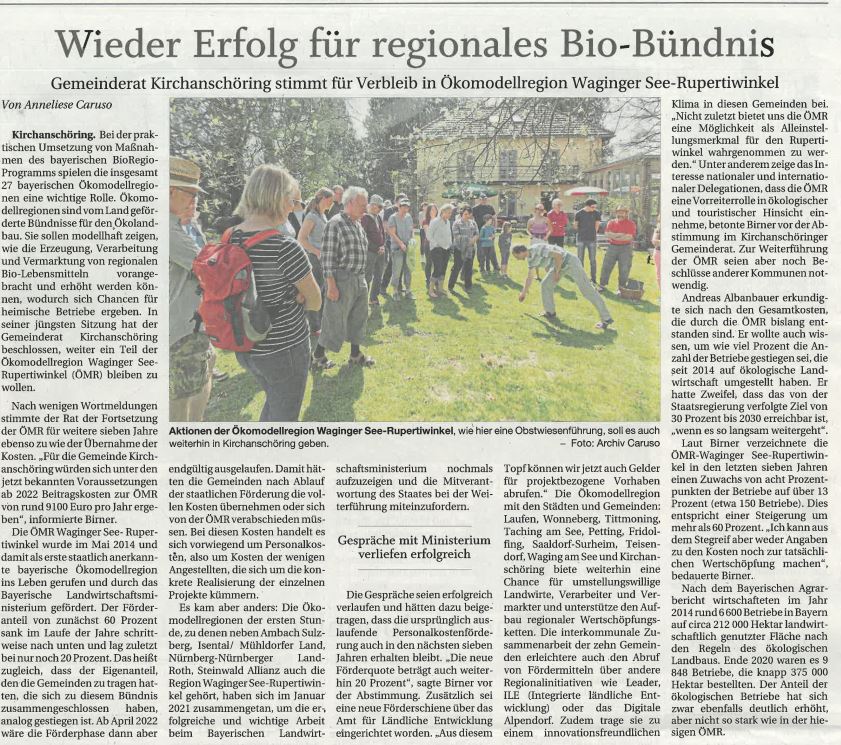 In seiner jüngsten Sitzung hat der Gemeinderat Kirchanschöring beschlossen, weiterhin ein Teil der Ökomodellregion Waginger See-Rupertiwinkel (ÖMR) bleiben zu wollen. Nach wenigen Wortmeldungen stimmte der Rat der Fortsetzung der ÖMR für weitere sieben Jahre ebenso zu wie der Übernahme der Kosten. „Für die Gemeinde Kirchanschöring würden sich unter den jetzt bekannten Voraussetzungen ab 2022 Beitragskosten zur ÖMR von rund 9.100 Euro pro Jahr ergeben“, informierte Birner.