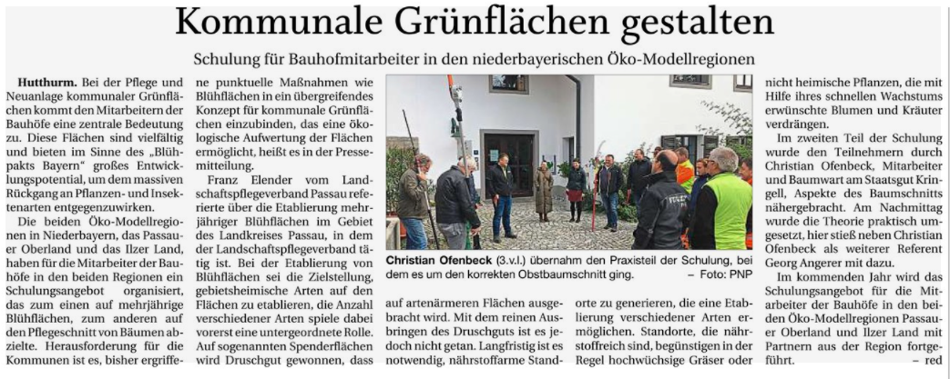 Die beiden Öko-Modellregionen in Niederbayern - das Ilzer Land und das Passauer Oberland - haben für die Mitarbeiter der Bauhöfe in den beiden Regionen ein Schulungsangebot organisiert, das zum einen auf mehrjährige Blühflächen, zum anderen auf den Pflegeschnitt von Bäumen abzielte. Herausforderung für die Kommunen ist es, bisher ergriffene punktuelle Maßnahmen wie Blühflächen in ein übergreifendes Konzept für kommunale Grünflächen einzubinden, das eine ökologische Aufwertung der Flächen ermöglicht.