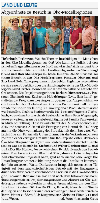 Die Öko-Modellregionen haben weiterhin Strahlkraft, denn durch den Aufbau und die Stärkung regionaler Bio-Wertschöpfungsketten bleiben die Waren- und Geldflüsse in der Region und leisten einen Beitrag zur Versorgungssicherheit der Menschen. Besonders wirkungsvoll scheint hierbei auch der ‚Verfügungsrahmen für Öko-Projekte‘, eine seit 2022 verfügbare Fördermöglichkeit für die Öko-Modellregionen. Durch diese Fördergelder wird die Öko-Modellregion nochmal ein Stück weit sichtbarer gemacht und kann Landwirtinnen und Landwirte in der Region unterstützen, kleinere Projekte umzusetzen, so Christian Fürst, federführender Bürgermeister der Öko-Modellregion Passauer Oberland. Zuletzt waren sich alle Beteiligten auf jeden Fall einig: Bürgermeister, Projektmanagerinnen und Akteure der Öko-Modellregion müssen weiterhin an einem Strang ziehen, um den Öko-Landbau mit seinen Stärken für Klima, Umwelt, Mensch und Tier in der Region und besonders in dieser schwierigen Phase weiter zu etablieren.