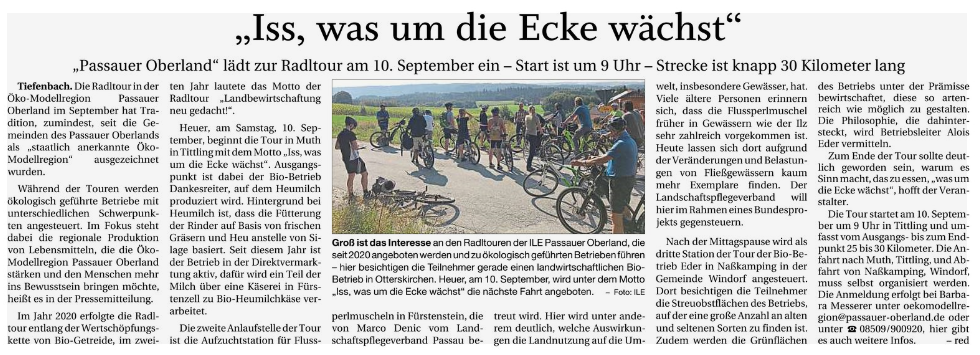 Im Jahr 2020 erfolgte die Radltour entlang der Wertschöpfungskette von Bio-Getreide. Während der Tour wurden ein Bio-Betrieb in Otterskirchen, ein Getreidehandel in Haselbach und eine Bio-Bäckerei in Tiefenbach angesteuert. Gemeinsam konnten die Teilnehmerinnen und Teilnehmer der Tour den Weg des Getreides vom Anbau, zur Aufbereitung und Reinigung des Getreides bis hin zur Verarbeitung und Veredelung verfolgen.