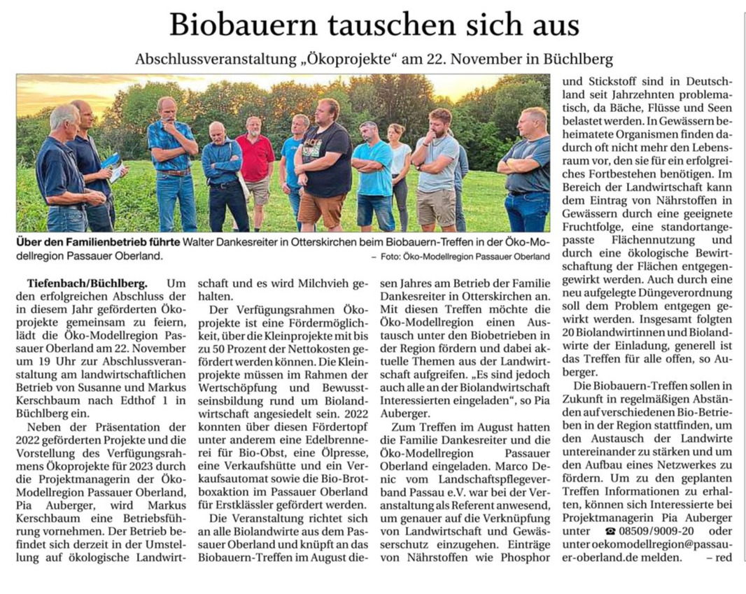 Um den erfolgreichen Abschluss der in diesem Jahr geförderten Ökoprojekte gemeinsam zu feiern lädt die Öko-Modellregion Passauer Oberland am 22. November um 19 Uhr zur Abschlussveranstaltung am landwirtschaftlichen Betrieb von Susanne und Markus Kerschbaum in Edthof 1, Büchlberg, ein.Neben der Präsentation der im Jahr 2022 geförderten Projekte und die Vorstellung des Verfügungsrahmens Ökoprojekte für das Jahr 2023 wird Markus Kerschbaum eine Betriebsführung vornehmen.Die Veranstaltung richtet sich an alle Biolandwirte und Biolandwirtinnen aus dem Passauer Oberland und knüpft an das Biobauern-Treffen im August diesen Jahres am Betrieb von Familie Dankesreiter in Otterskirchen an. Mit diesen Treffen möchte die Öko-Modellregion einen Austausch unter den Bio-Betrieben in der Region fördern und dabei aktuelle Themen aus der Landwirtschaft aufgreifen.