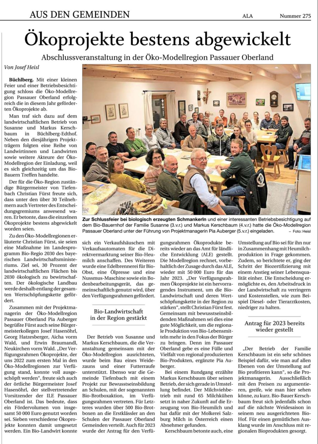 Der Antrag für den Verfügungsrahmen Ökoprojekte 2023 wurde bereits wieder von den Projektmanagerinnen der Öko-Modellregion ans Amt für Ländliche Entwicklung gestellt. Somit sollen wieder unter Vorbehalt der Zusage durch das Amt 50 000 Euro für das Jahr 2023 zur Verfügung stehen. „Der Verfügungsrahmen Ökoprojekte ist ein tolles Instrument um die Bio-Landwirtschaft und deren Wertschöpfungskette in der Region zu stärken. Gemeinsam mit bewusstseinsbildenden Maßnahmen ist dies eine gute Möglichkeit um die regionale Produktion von Bio-Lebensmitteln mehr in den Fokus der Bürgerinnen und Bürger zu bringen, denn“, so Pia Auberger, „im Passauer Oberland sind wir von einer Fülle und Vielfalt von regional produzierten Bio-Produkten umgeben.“