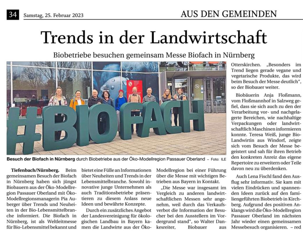 Am 17. Februar besuchten 7 interessierte Bio-Akteure aus der Öko-Modellregion Passauer Oberland die BIOFACH in Nürnberg. Beim gemeinsamen Ausflug konnten sie sich mit der Öko-Modellregionsmanagerin Pia Auberger über Neuheiten und Innovationen im Bereich Bio-Lebensmittel informieren und sich darüber austauschen.Die Weltleitmesse für Bio-Lebensmittel bietet einen breiten Rahmen für die ausführliche Information über Bio-Lebensmittel, aber auch Naturkosmetik, nachhaltige Verpackungen oder Maschinen rund um die Verarbeitung- bzw. Prozesstechnik im Lebensmittelhandwerk bzw. in der Lebensmittelindustrie. Abgerundet wurde der Besuch durch eine Führung der LVÖ zu ausgewählten Ausstellern auf der Fachmesse.Unser Fazit: Wir kommen nächstes Jahr gerne wieder!