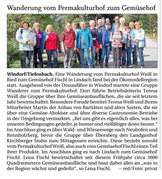 Nach dem Mittagessen ging die Wanderung weiter nach Lindach zum Gemüsehof Fischl. Lena Fischl bewirtschaftet seit diesem Frühjahr circa 3000 m2 Gemüseanbaufläche und baut dabei alles an „was in der Region wächst und gedeiht“, so Lena Fischl. Ihr Gemüse vertreibt die junge Frau einerseits direkt ab Hof und über den Edekamarkt Schwaiberger, was sich als gute Zusammenarbeit erwiesen hat. „Mir ist es wichtig den Kundinnen und Kunden eine gewisse Flexibilität beim Einkauf anzubieten“ so Lena Fischl zu ihrem Vertriebskonzept. Deswegen ist bei ihr der Kauf von Gemüsekisten genauso möglich wie der Vertrieb ab Hof oder auf Vorbestellung.