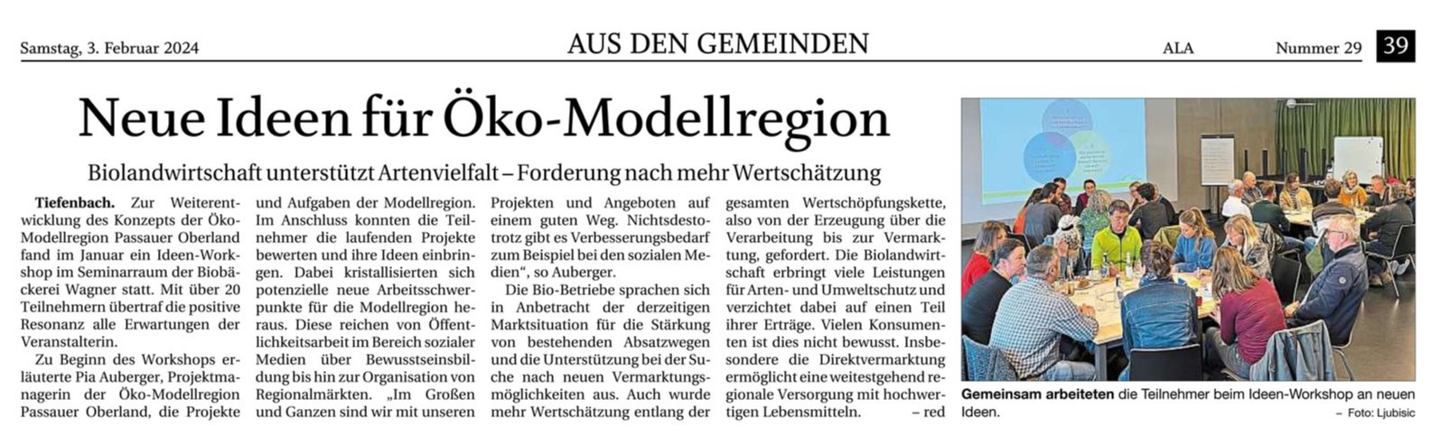 Dabei kristallisierten sich einige potenzielle neue Arbeitsschwerpunkte für die Öko-Modellregion heraus. Diese reichen von Öffentlichkeitsarbeit im Bereich sozialer Medien über Bewusstseinsbildung bis hin zur Organisation von Regionalmärkten und Vernetzungsangeboten. Die Bio-Betriebe sprachen sich in Anbetracht der derzeitigen Marktsituation für die Stärkung von bestehenden Absatzwegen und die Unterstützung bei der Suche nach neuen Vermarktungsmöglichkeiten aus. Dabei müssen Angebot und Nachfrage Hand in Hand gehen, so das Fazit der Teilnehmerinnen und Teilnehmer.