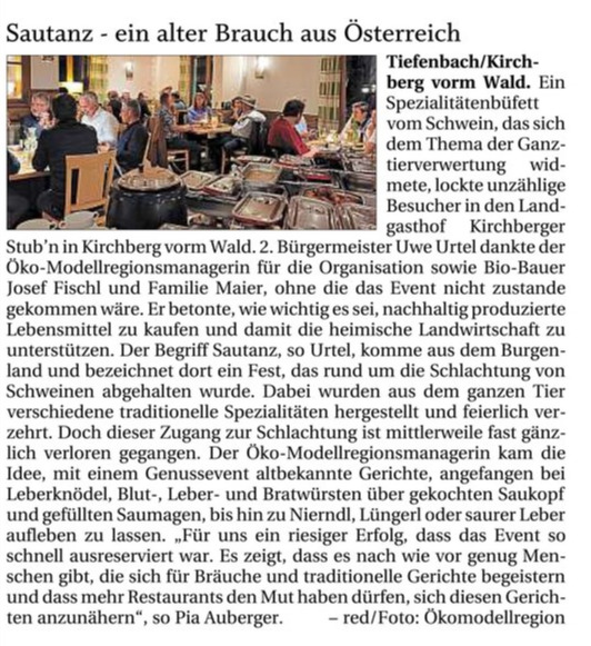 Das Schwein stammte vom Gemüsehof Fischl aus Lindach, der sich derzeit in Umstellung auf ökologische Landwirtschaft befindet und nur wenige Kilometer vom Landgasthof entfernt ist. Wilfried Maier, der wie kein anderer sein Handwerk im Bereich der Ganztierverwertung versteht, zauberte aus dem ganzen Schwein herzhafte Gerichte und begeisterte seine Gäste mit einem Spezialitätenbüffet der besonderen Art. Die von der Kirchberger Stub’n organisierte Stubenmusik sorgte für einen stimmungsvollen Ausklang des Abends. Da im Vorfeld bereits einige Reservierungsanfragen aus Kapazitätsgründen abgesagt werden mussten wird im Herbst dieses Jahres voraussichtlich ein Folgeevent stattfinden.