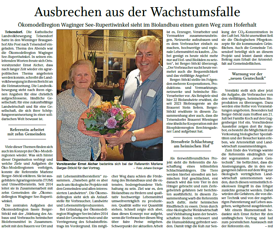 Viele dieser Themen finden sich auch im Konzept der Öko-Modellregionen wieder. Was sich hinter dieser Organisation genau verbirgt und welche Ziele und Aufgaben die Öko-Modellregionen verfolgen, konnte die Referentin des Abends Frau Marlene Berger-Stöckl erklären. Sie ist ausgebildete Agraringenieurin (TUM) und Umweltberaterin. Seit 2014 leitet sie in Zusammenarbeit mit zehn Gemeinden die „Ökomodellregion Waginger See- Rupertiwinkel“. Die zentralen Aufgaben der Ökomodellregion fasste Berger-Stöckl mit der „Stärkung des Anbaus und Verbrauchs heimischer Biolebensmittel in Zusammenarbeit mit den Bauern vor Ort und mit Lebensmittelherstellern“ zusammen. „Daneben geht es aber auch um ökologische Projekte mit den Gemeinden und allen interessierten Landwirten“. Die Ökomodellregion sieht sich als Anlaufstelle für Verbraucher, Landwirte und Lebensmittelproduzenten.