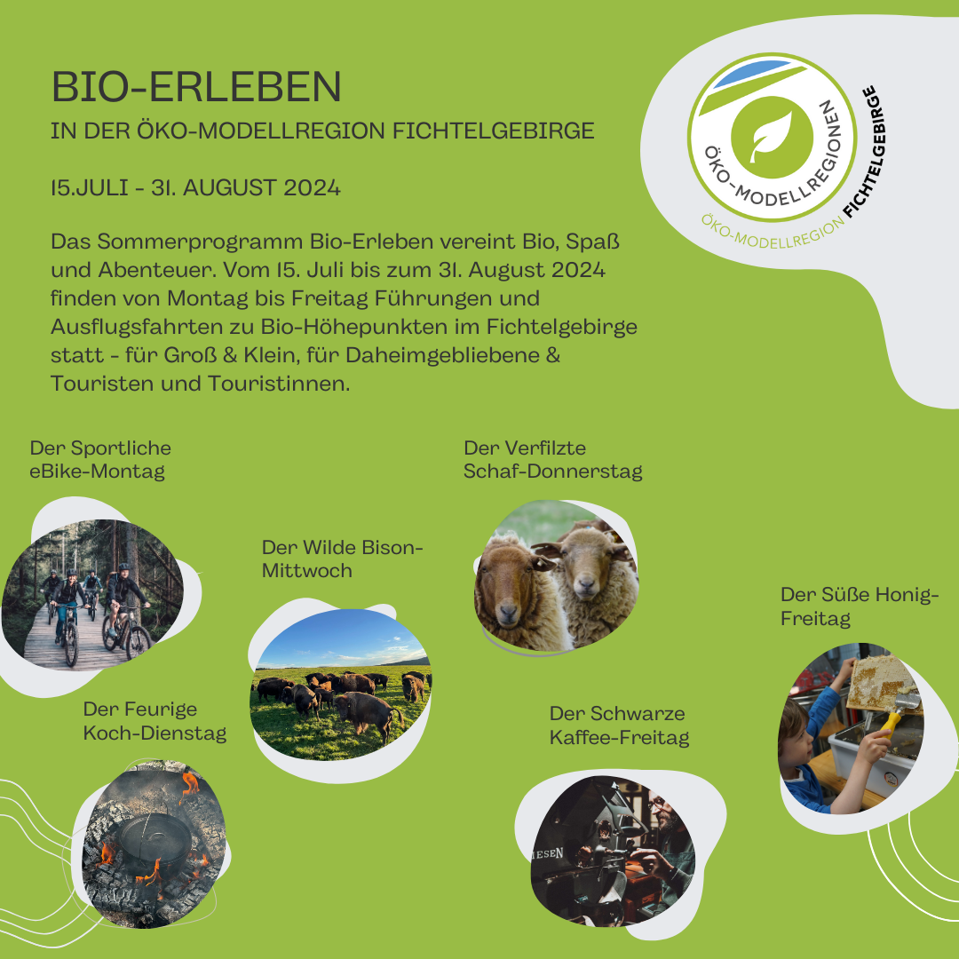 Eine kleine Mischung aus „Safari und Wildem Westen“ erwartet die Teilnehmenden jeden Mittwoch beim Wilden Bison-Mittwoch. Bisons und Rotwild teilen sich hier im Familienverbund ein großes und malerisch gelegenes Wildgehege. Bei einer Rundfahrt kann man die eindrucksvollen Tiere beobachten. Familie Höpfel teilt gerne ihr Wissen über naturnahe Bio-Gehegewild-Haltung und Vermarktung hofeigener Produkte. Treffpunkt: Ferienhof Fichtelgebirge, Sichersreuth 19, 95680 Bad Alexandersbad, Beginn: 16 Uhr, Dauer: ca. 60 - 90 min., Kosten: pro Person 8 €, 13-16 Jahre 4 €, bis 12 Jahre frei, Anmeldung: Telefon: 09232/700660, Anmeldung bis 12 Uhr am Vortag. Der Wilde Bison-Mittwoch findet in Kooperation mit der Öko-Modellregion Steinwald statt.