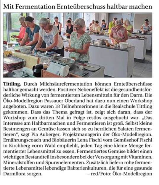 Dies und noch vieles mehr war Inhalt des Fermentations-Workshops in der Öko-Modellregion Passauer Oberland, der Anfang Juli in der Realschule Tittling mit 18 Teilnehmerinnen stattfand. Dass das Thema aktuell und gefragt ist zeigt sich daran, dass der Workshop zum dritten Mal in Folge restlos ausgebucht war. „Das Interesse am Haltbarmachen und Fermentieren ist groß. Selbst kleine Restmengen an Gemüse lassen sich so zu herrlichen Salaten fermentieren“, sagt Pia Auberger, Projektmanagerin der Öko-Modellregion Passauer Oberland. Ernährungscoach und Biobäuerin Lena Fischl vom Gemüsehof Fischl in Kirchberg vorm Wald empfiehlt jeden Tag eine kleine Menge fermentierter Lebensmittel zu essen.