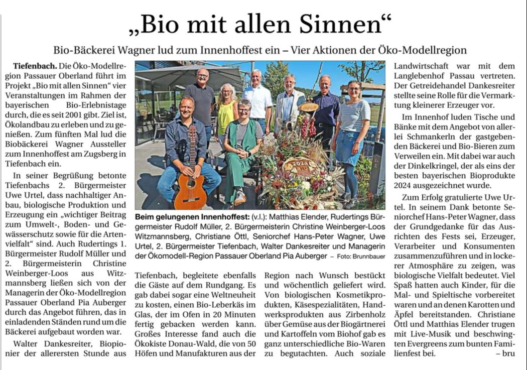 Mitte September zog das Innenhoffest der Biobäckerei Wagner wieder viele Gäste in die Hauptfiliale nach Tiefenbach. Christiane Öttl und Mathias Elender sorgten für die musikalische Umrahmung des Fests, das neben einem regionalen Biobauern-Markt, einem bunten Kinderprogramm und Führungen durch die Bäckerei wieder viel zu bieten hatte.