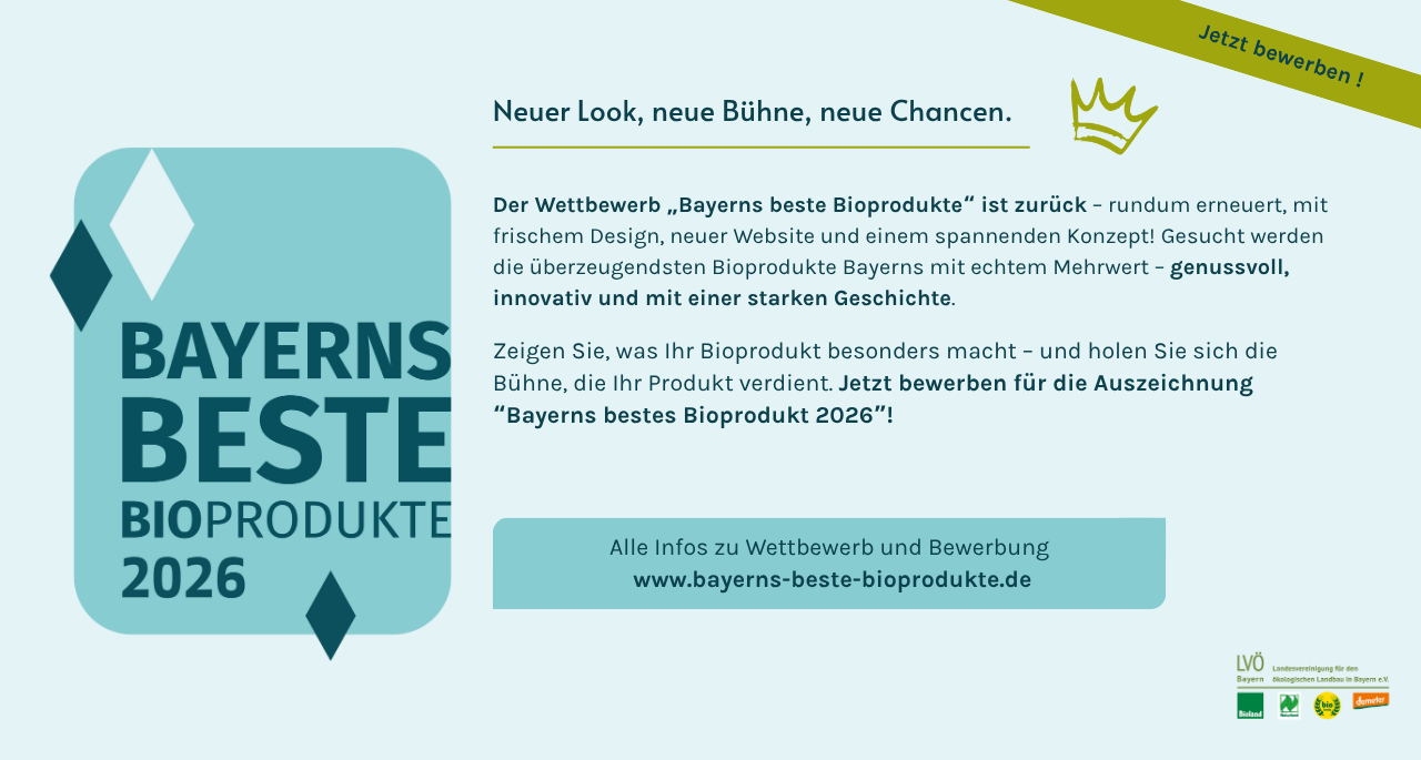 - Wettbewerb „Bayerns Beste Bioprodukte“ startet wieder – s. Downloads