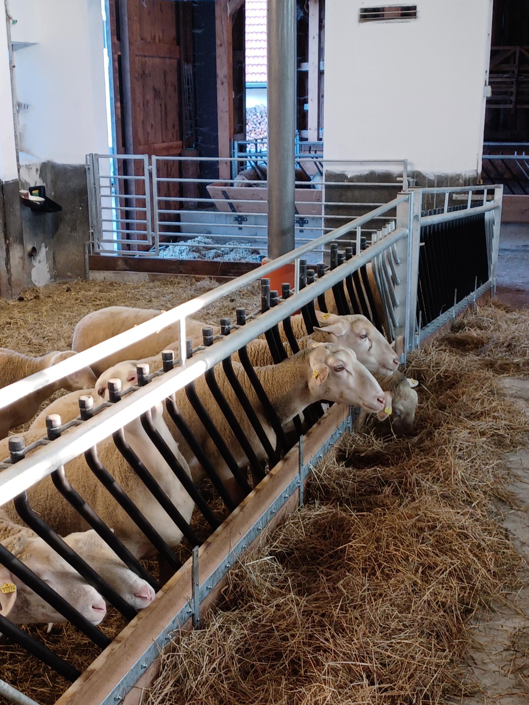 - Umbau Kuhstall zum Schafstall (Milchschafherde): Förderung von Fressgittern. Einbau der lämmersicheren Futtertischhorden (inkl. zurei lämmersichere Tore) im umgebauten Kuhstall ist es jetzt möglich, die Lämmer in der Herde mit laufen zu lassen. Die späziellen Futtertischhorden verhinöem das'Uurchschlüpfen" der Lämmer.