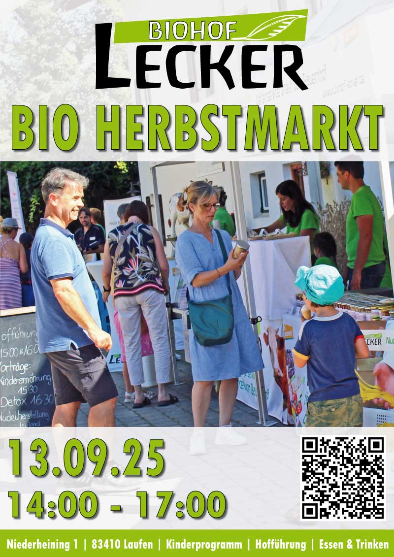 - Samstag, den 13. September von 14-17 Uhr: Einladung zum Herbstmarkt auf dem Biohof Lecker in Laufen, Niederheining 1, s. Anhang