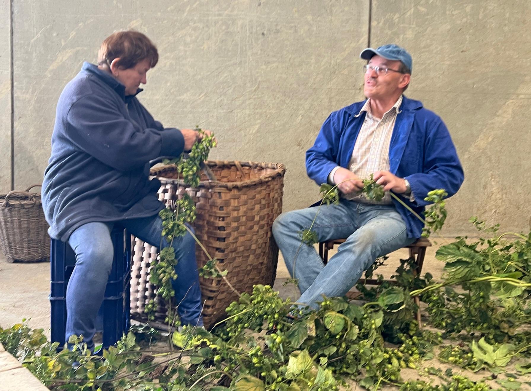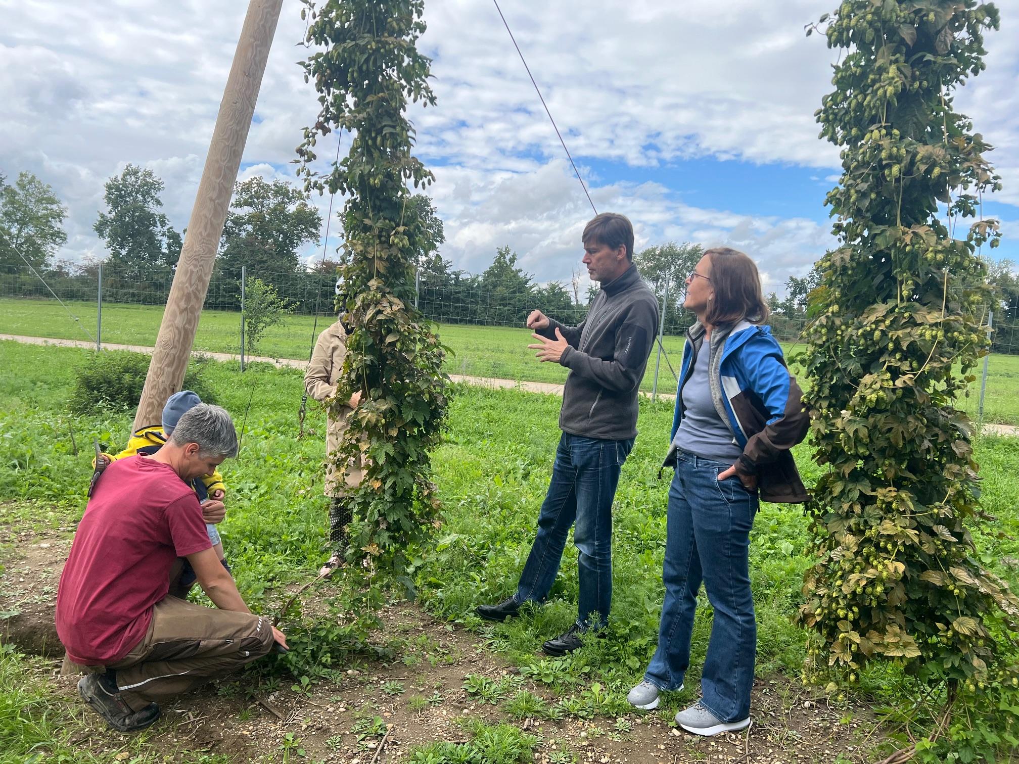 Im Rahmen der Ökoerlebnistage öffneten die Birkanschwaige und Griesmüllers Altstadtbrauerei die Türen für Besucher. Die Radtour führte durch den Zucheringer Wald zum Hopfengarten im Hühnerauslauf. An diesem Tag waren die Profi-Hopfenzupfer da, die noch wissen wie es früher war: für einen großen Korb voll Dolden wurden 80 Pfennig bezahlt. Acht bis zehn Körbe am Tag waren zu schaffen. Während der Hopfenernte sollte man damals nicht durch die Holledau fahren. Die Drähte, an denen der Hopfen in die Höhe rankt, wurde einfach mitgehäckselt und die Straßen waren voll mit Drahtstücken. Die Radler konnten auch das Zupfen probieren, aber keiner hätte auch nur annähernd so viel geschafft. Heute erledigt das Zupfen ein Hopfen-Vollernter.