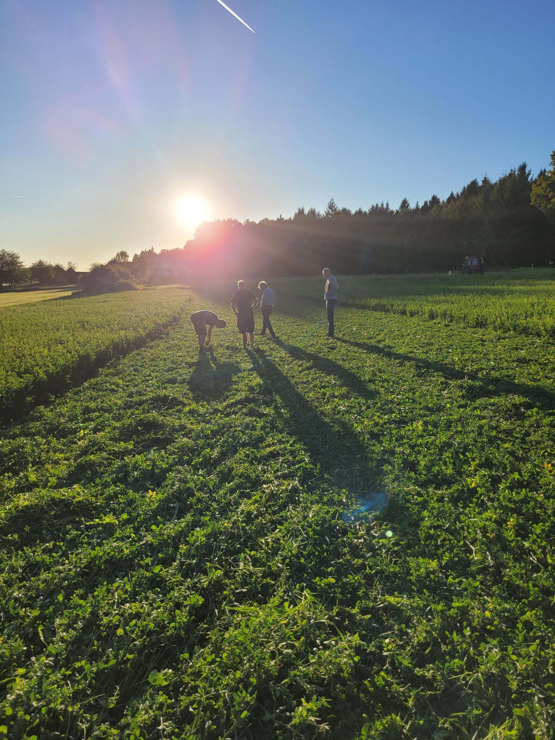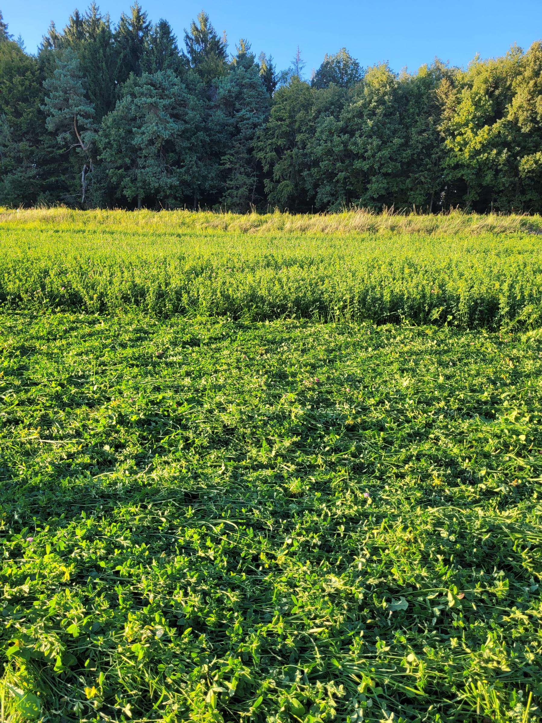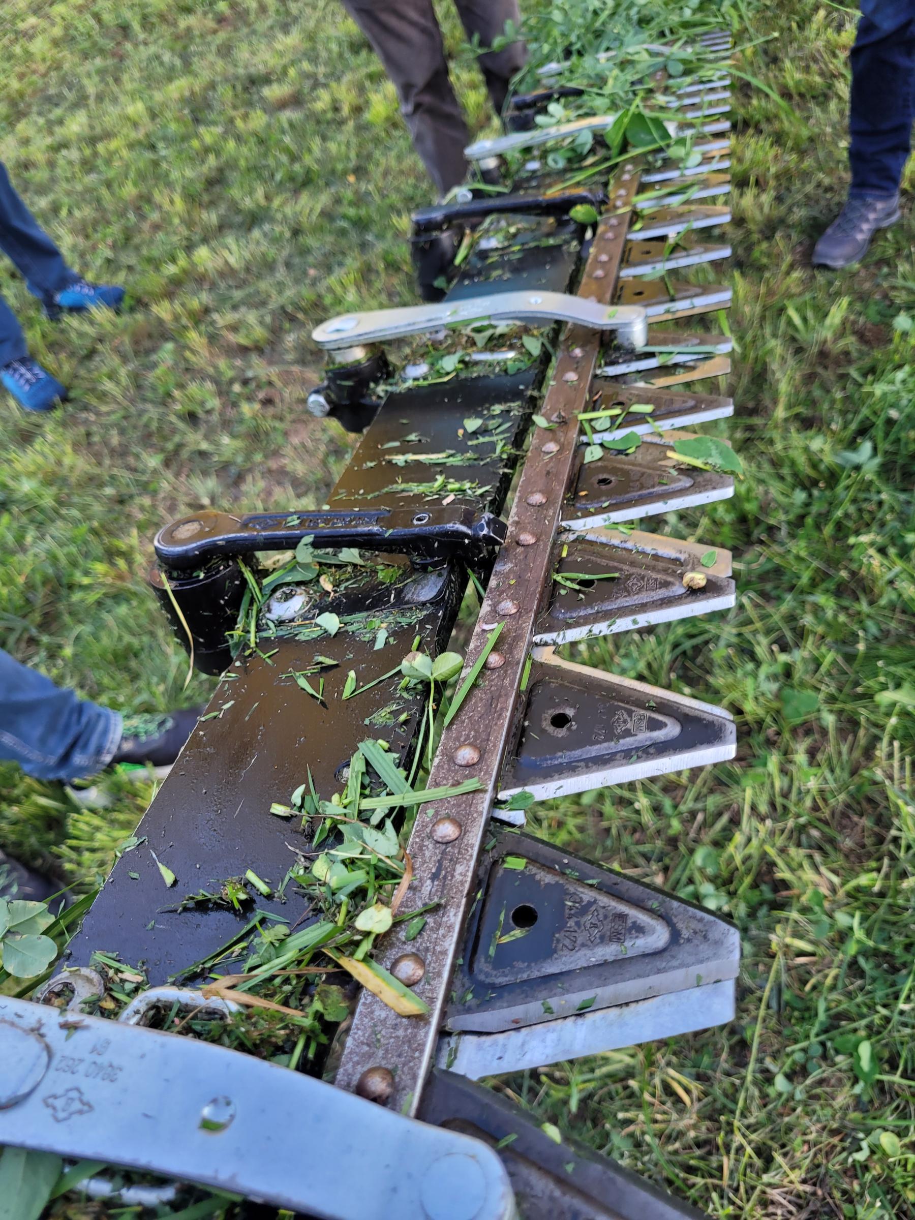 Das Doppelmessermähwerk der Firma KEMA ist nun seit mehreren Monaten sehr erfolgreich im Einsatz und Stefan Simmerlein begeistert von Technik und vor allem dem Mähergebnis. Davon konnten sich auch die Teilnehmer*innen des Stammtischs überzeugen: nach einer Begrüßung und Vorstellung des Mähwerkes in der Maschinenhalle ging es hinaus auf ein naheliegendes Feld mit Kleegras. Ein gutes Tagwerk des Aufwuchs hatte Stefan Simmerlein extra stehen gelassen und konnte nun vorführen wie unkompliziert, gleichmäßig und zügig die Mäharbeiten mit dem Doppelmessermähwerk von statten gehen. Auch die kritischen Kontrollblicke und Schnittproben teilnehmender Landwirt*innen bestätigten dies.