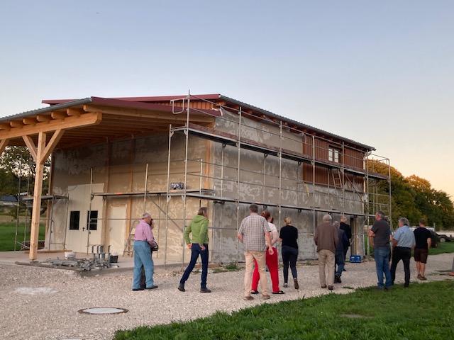 Der Rückweg vom Feld zum Betrieb führte über das in Aufbau befindliche Schlachthaus von Robin Körber. Hier bekamen die Teilnehmer*innen eine exklusive Führung. Im Frühjahr 2026 möchte Robin Körber das Schlachthaus in Betrieb nehmen. Es ist für 4-5 Schlachtungen pro Tag ausgelegt und soll durch einen Schlachtanhänger, der Teilmobile Schlachtungen auf anderen Betrieben ermöglicht, ergänzt werden. Schlachthaus und Schlachthänger sind ein wichtiger Baustein im Aufbau der Wertschöpfungskette Fleisch in der Region: bisweilen sind die nächsten Schlachthöfe Erlangen und Bamberg. Der dadurch erforderliche Transport der Schlachttiere versursacht Stress und CO2 Ausstoß. Beides lässt sich durch kurze Wege reduzieren. „Kurze Wege entlang der gesamten Wertschöpfungskette sind ein wichtiger Baustein in Bezug auf Nachhaltigkeit,“ findet Ariane Volkmann, die seit September die Öko-Modellregion Fränkische Schweiz zusammen mit Laura Pircher (ehem. Kraus) als Projektmanagerin ergänzt.
