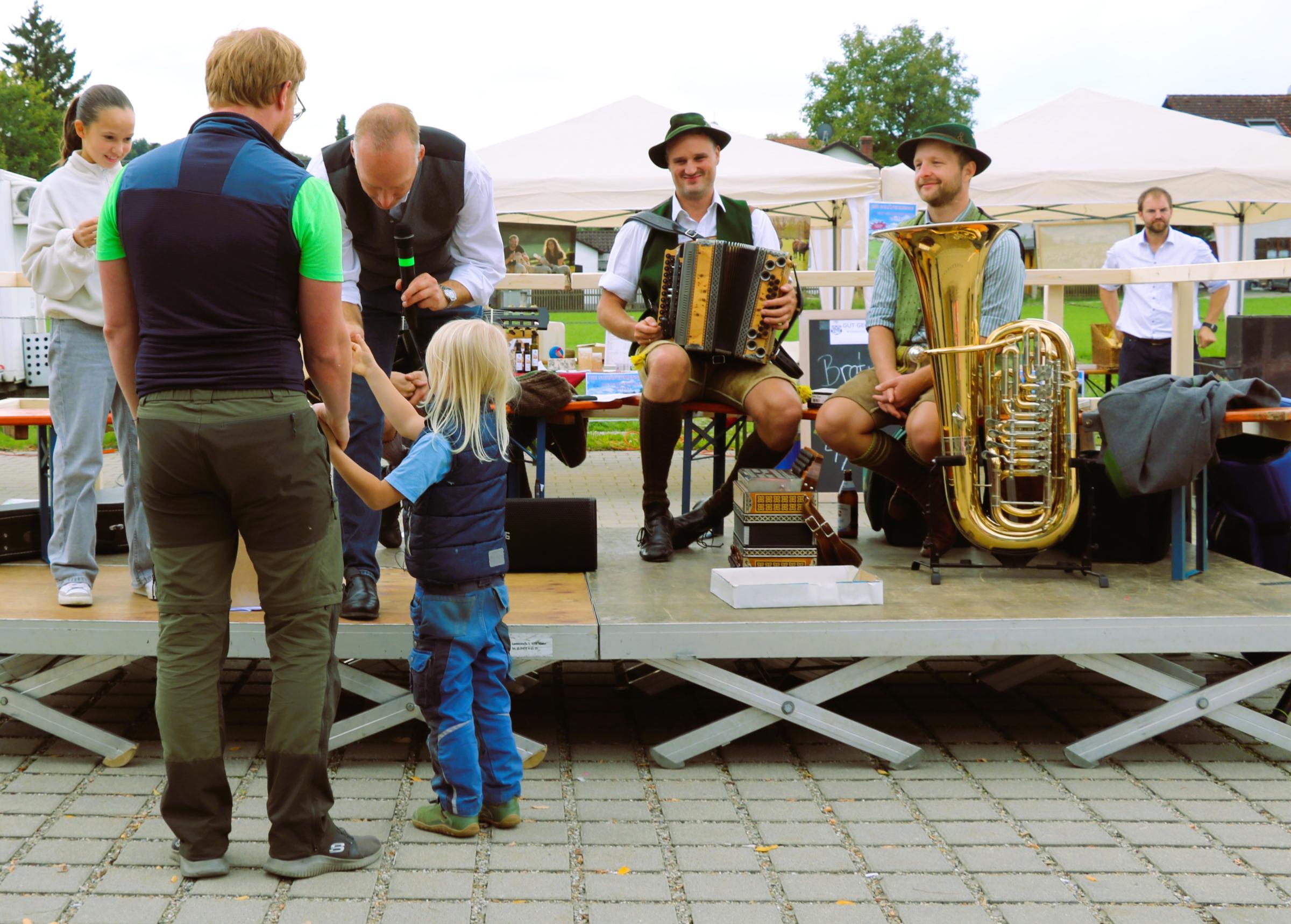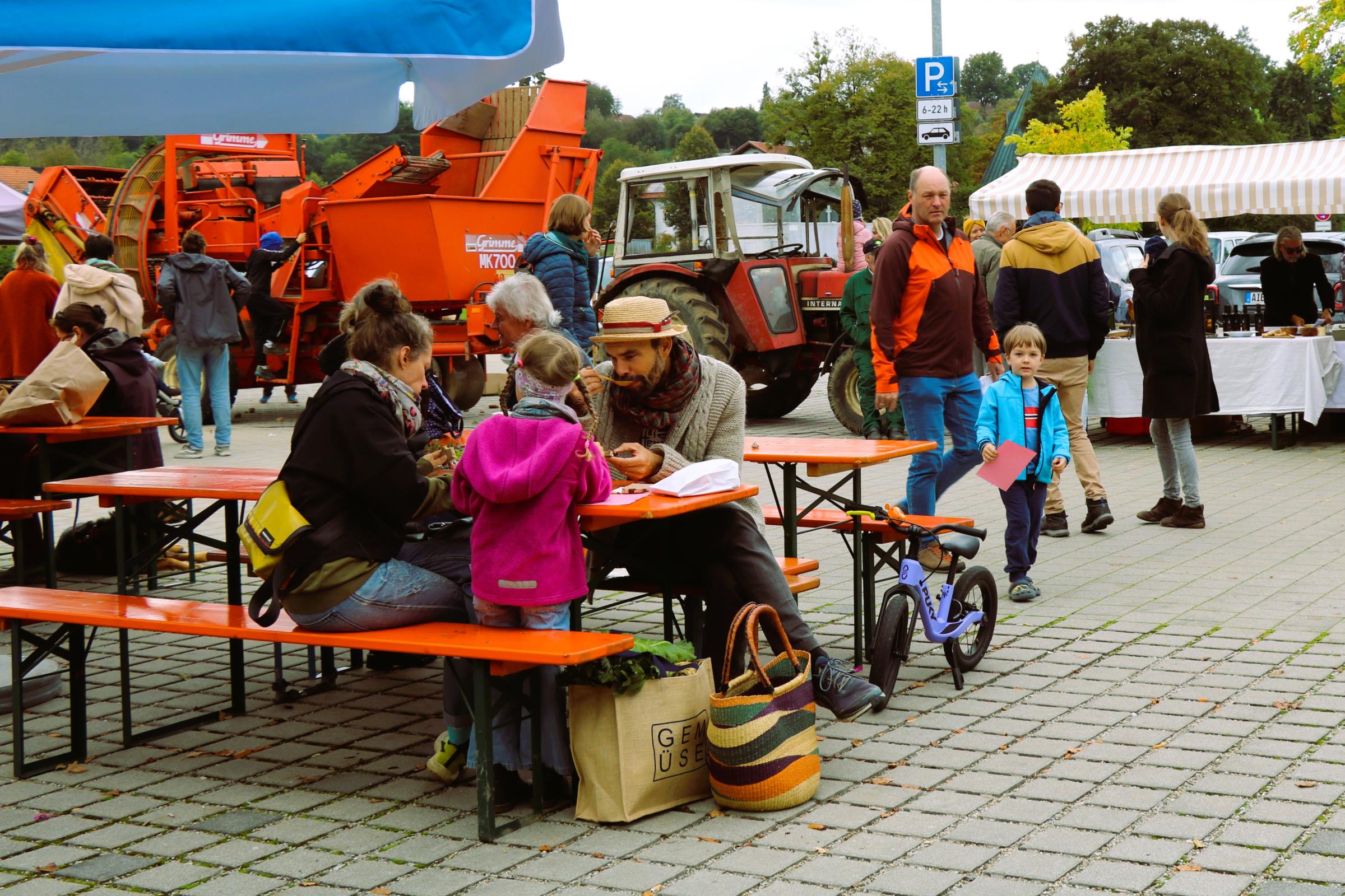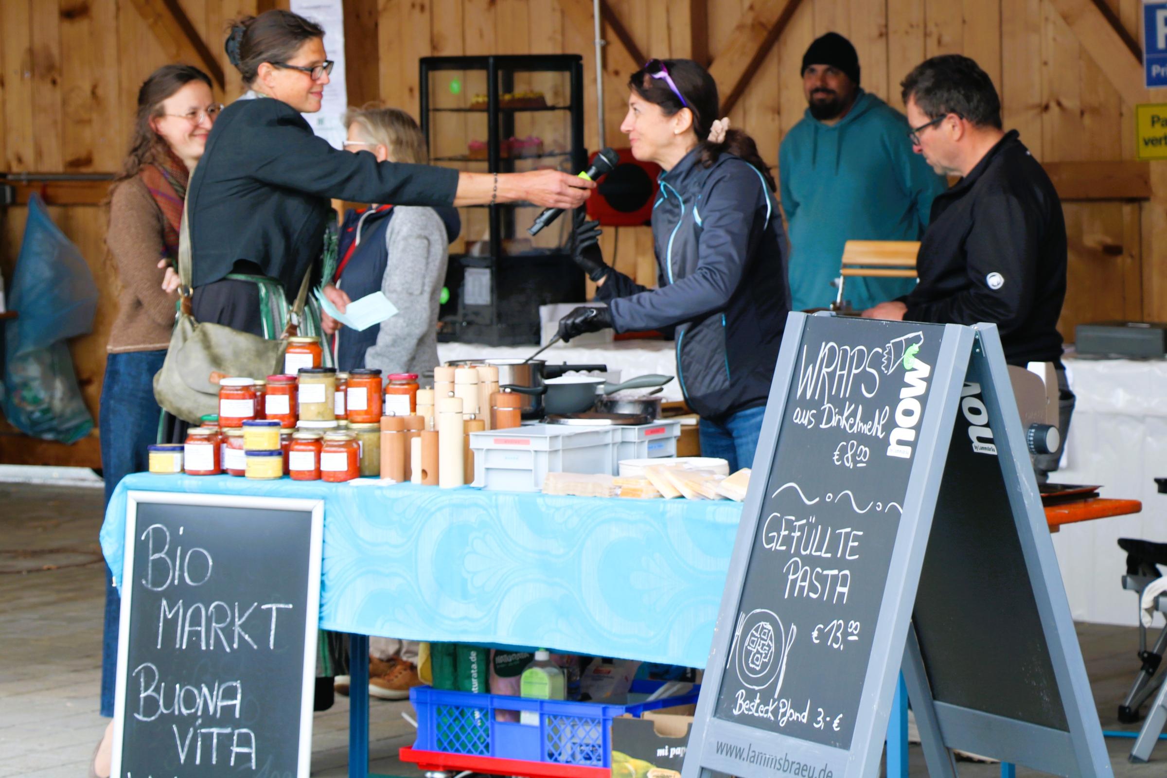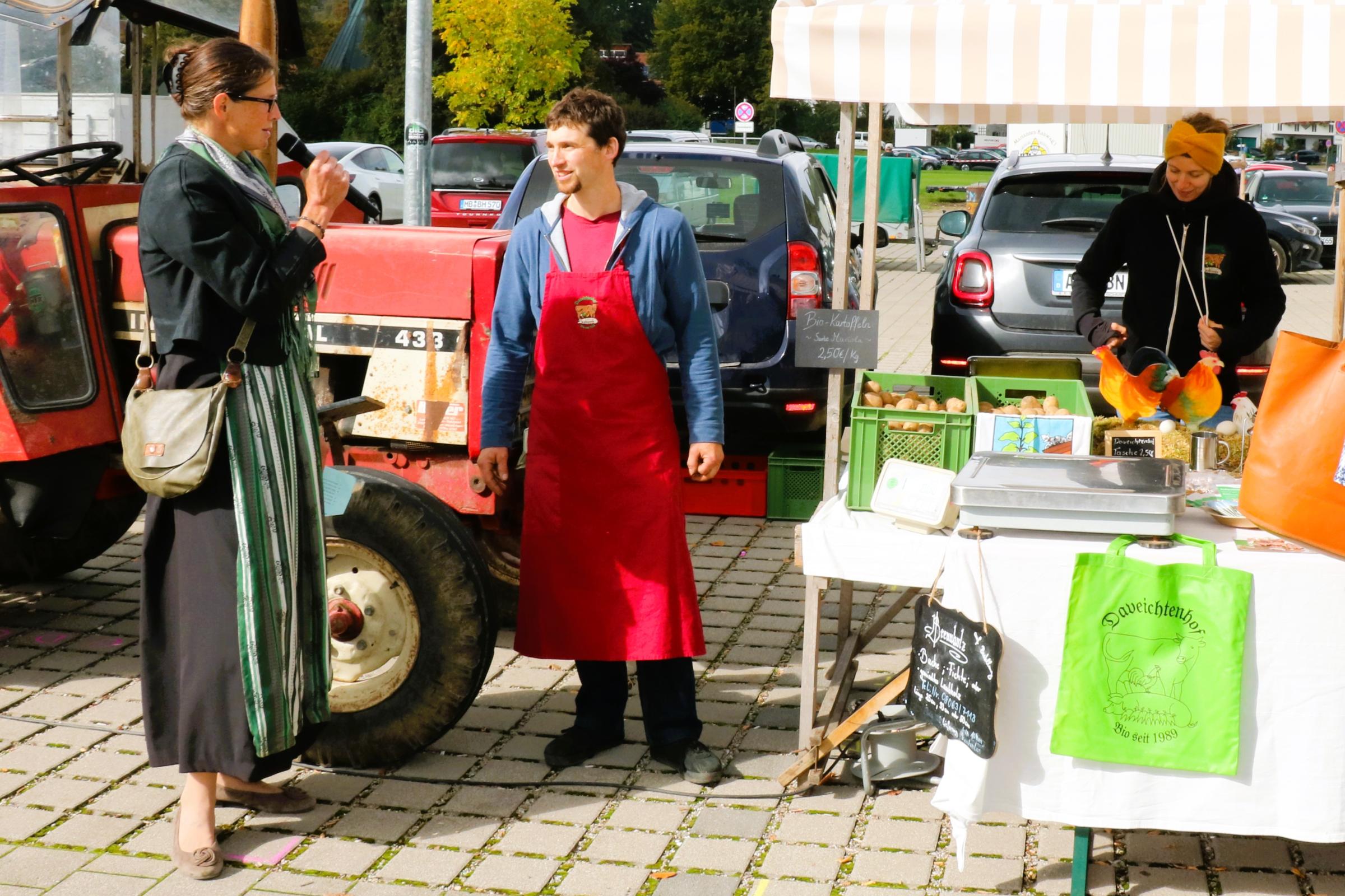 Während Roberta Buona Vita vom gleichnamigen Bio-Markt in Feldkirchen-Westerham ganz routiniert frische Pasta für die BesucherInnen zubereitete, war es für andere Betriebe der erste „öffentliche“ Auftritt überhaupt. So freute sich Niko Faßnacht, Inhaber eines kleinen Feldkirchner Geschäfts für Bio-Oliven genauso über die Einladung zum Markt wie Stefan Gebhardt, Bio-Landwirt aus Krügling. Er verkaufte einen Großteil seiner mitgebrachten Kartoffeln in Glonn. Sein Roder, den er als Dekoration neben seinem Stand parkte, war genauso eine Attraktion für Kinder wie das „Kuhquiz“ des Milchviehbetriebs Behamhof aus Aying, der auch „Kuhpatenschaften“ anbot. Gitti Riedl vom Zehatmoarhof vertrat mit Ihren Eier die Gemeinde Baiern am Markt. Beim Gemüse wurden verschiedene Arten der Vermarktung sichtbar: Bei Leoni Schmid von der gleichnamige Gärtnerei in Glonn und bei Anna Fritzsche von der Oberpframmener Maierei konnte man die knackigen Vitaminlieferanten gleich mitnehmen oder im Abo bestellen. Am Stand der SoLaWi fair & teilen konnte man seinen Geschmacksinn bei der Gemüse-Blind-Verkostung testen und sich dabei über die die Besonderheit der Solidarischen Landwirtschaft informieren. Für die Stärkung nach dem Einkauf sorgte das Wirtshaus Taglaching aus Bruck, das Gut Georgenberg und der Glonner Bio-Pionier Herrmannsdorfer Landwerkstätten. Relaxen konnte man schließlich am Liegestuhl des Guts Sonnenhausen. Christiane Daxenbichler aus Tuntenhausen lebte an ihrem Stand gemeindeübergreifende Zusammenarbeit ganz praktisch vor. Sie bot neben den eigenen Bio-Weideenten für Weihnachten auch den Apfelsaft der Familie Raß aus Feldkirchen-Westerham zum Kauf an.