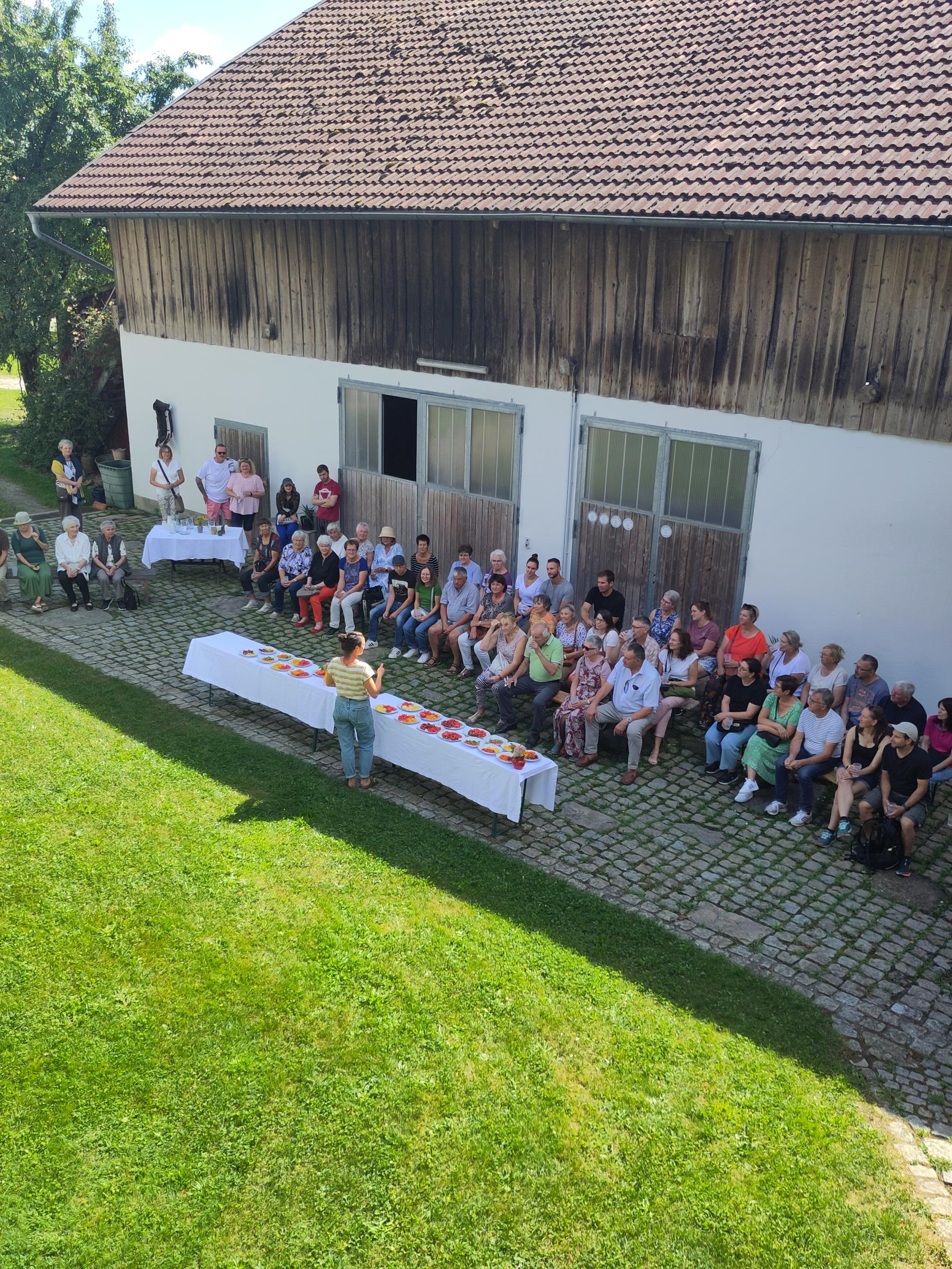 Der Floßmannhof liegt malerisch oberhalb des Ilztals. Seit 2022 führt Anja Floßmann die Bio-Gemüsegärtnerei auf dem ehemaligen Milchviehbetrieb. Mittlerweile besitzt sie drei Thermo-Gewächshäuser und ein großes Feld mit Freilandgemüse, dass sich sehen lassen kann. Bekannt ist sie vor allem für ihre Tomaten. Mehr als 25 Sorten baut sie auf ihrem Betrieb an. Die Sorten unterscheiden sich in Farbe, Form und Größe. Neben ein paar Ertragssorten, hat sich die Bio-Gemüsebäuerin auf alte Sorten und Raritäten spezialisiert. Dass sie damit genau ins Schwarze bei den Gemüseliebhabern trifft, zeigt sich jährlich bei den Bio-Erlebnistagen. So auch in diesem Jahr. Nach einer Hofführung, bei der man mit spannenden Tipps und Tricks versorgt wurde, startete die Tomatenverkostung. Zu jeder Sorte wusste Anja Floßmann Details zu Herkunft, Geschmack und Verwendung. Von den eher milderen Fleisch- und Eiertomaten ausgehend konnte man sich zu den geschmacksintensiveren Sorten, die vorwiegend aus Cocktailtomaten bestanden, durchprobieren. Das bescherte das eine oder andere Aha-Erlebnis bei den Teilnehmenden, die sichtlich begeistert von der Tomatenvielfalt waren.
