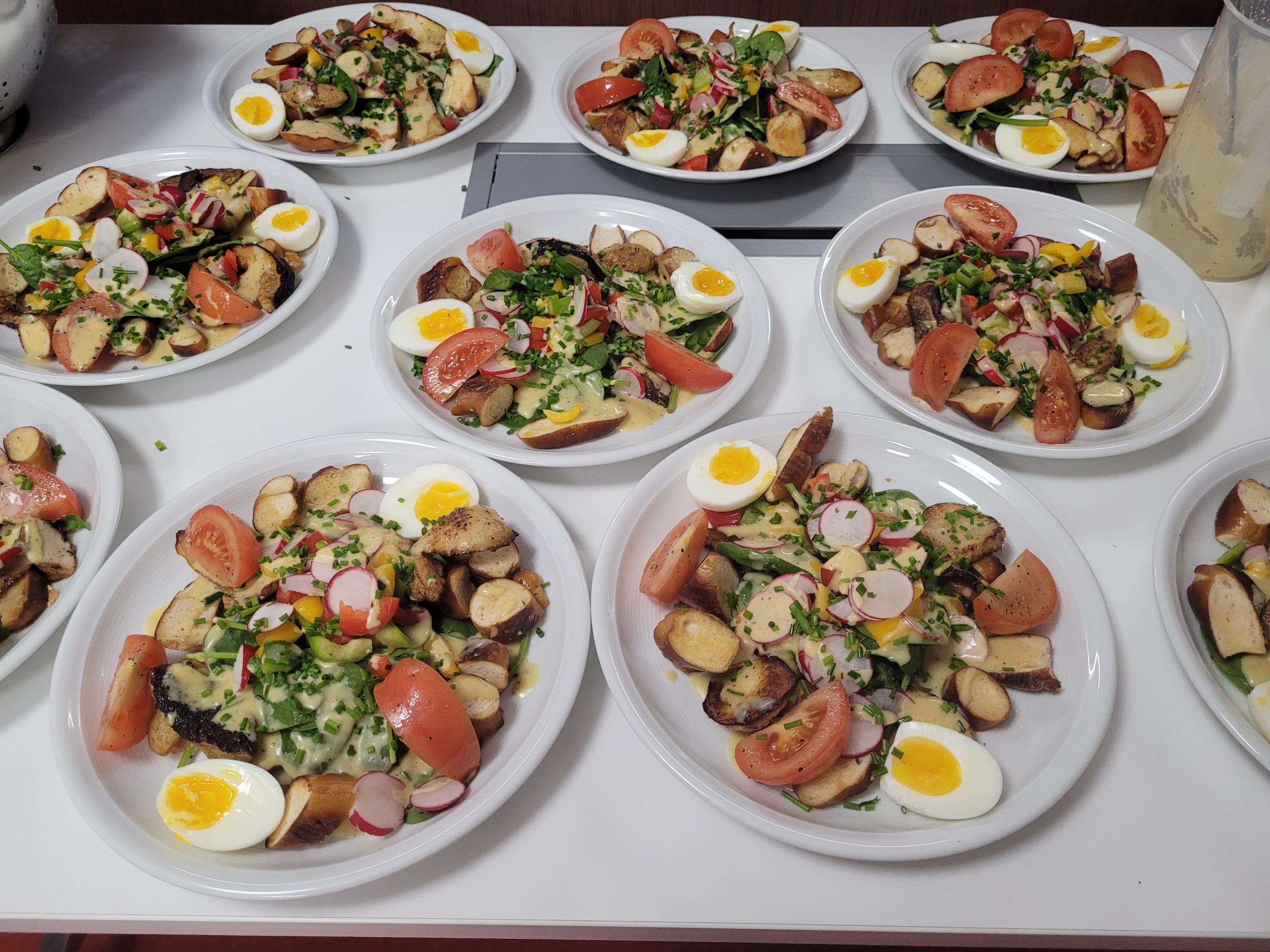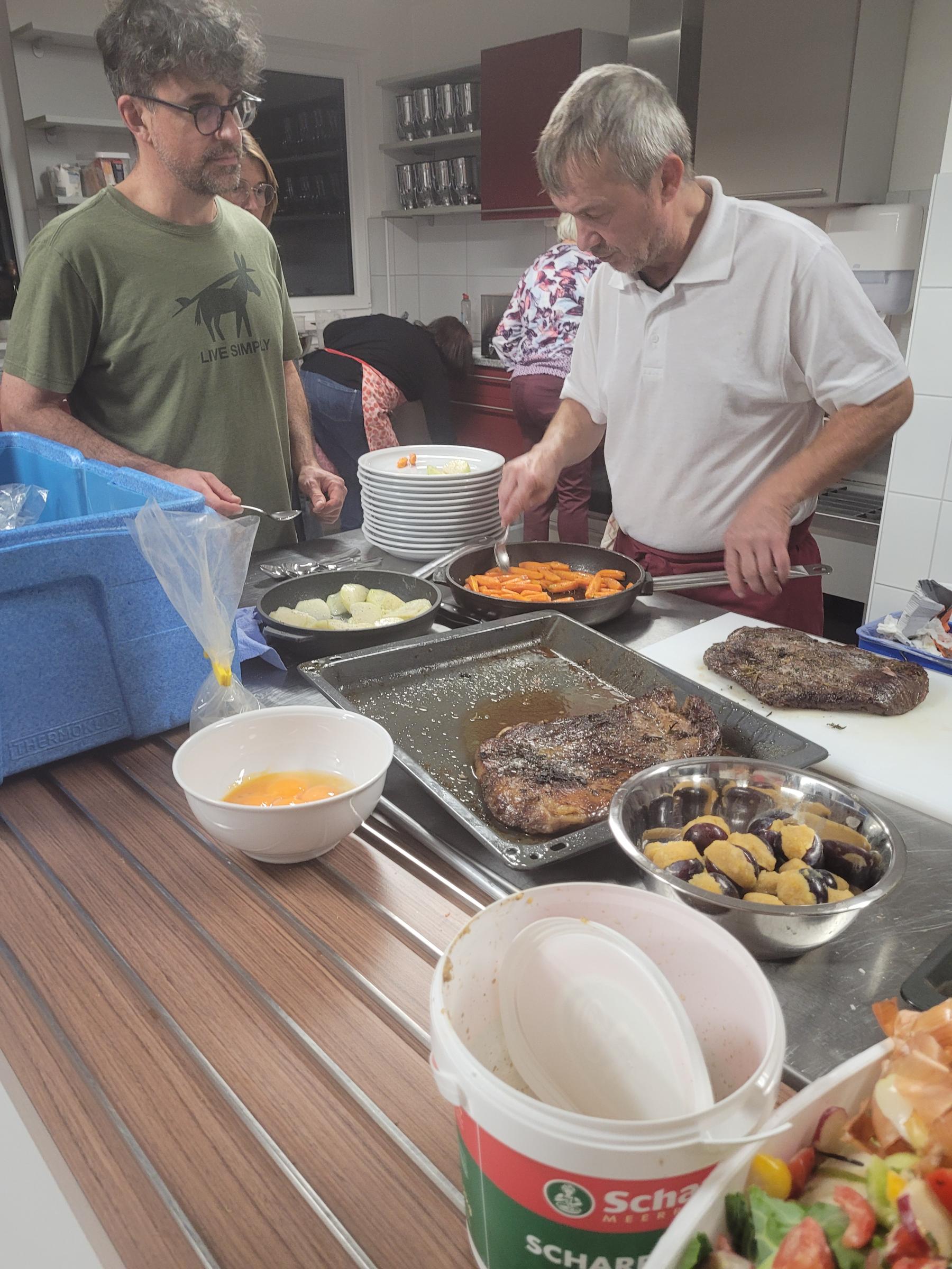 Einige der Teilnehmer*innen sind Wiederholungstäter*innen und besuchen die Kochkurse Günter Sponsels bereits seit der 1. Stunde. Beim bio-regionalen Schwerpunkt war die Gruppe gut durchmischt von Profis und Neulingen, die alle zu einem gelungenen Ablauf beitrugen. Spätestens nach der Vorspeise war allen klar: so ein Kochkurs ist eine Wiederholung wert!