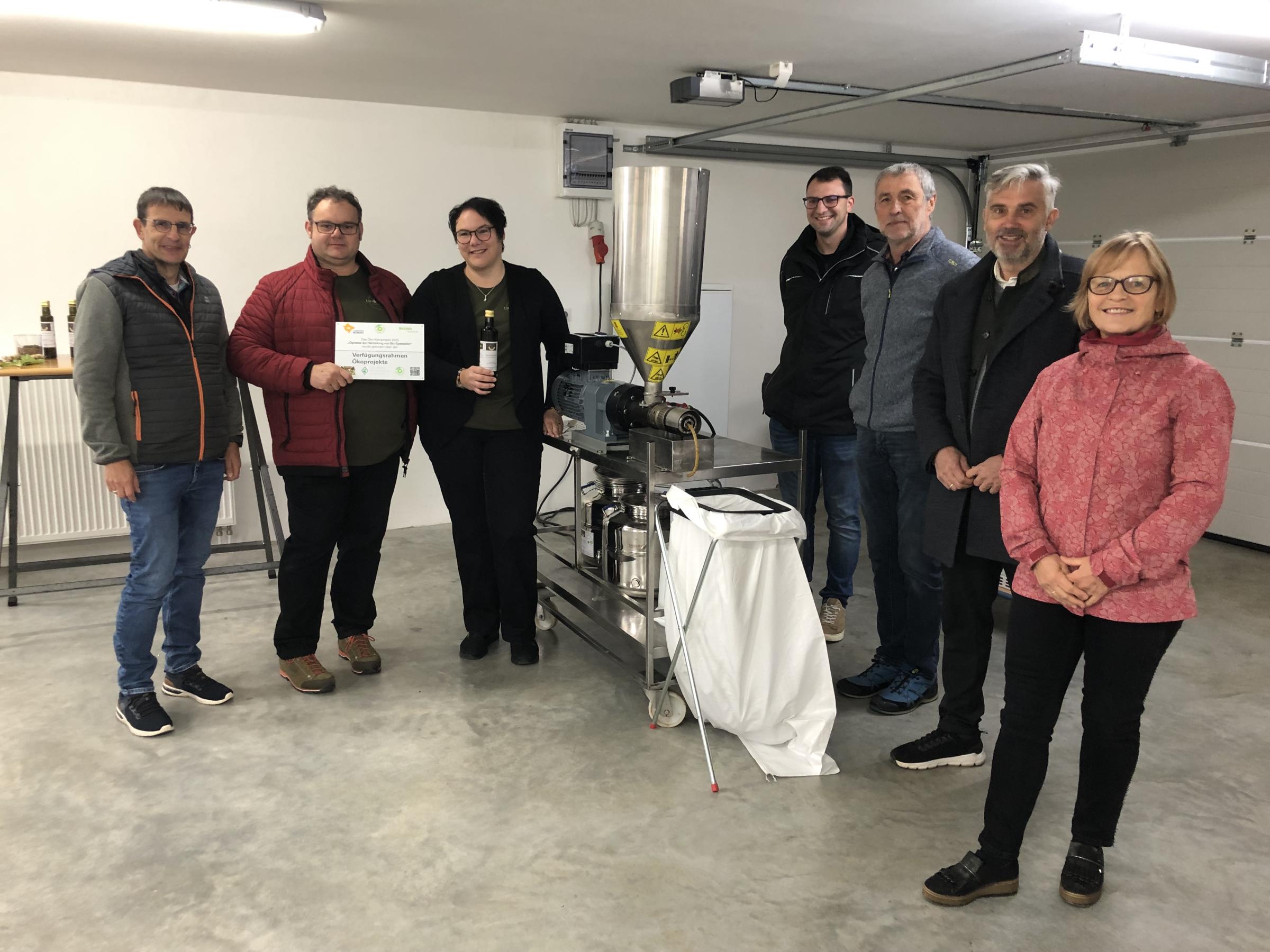 Das Biolandwirts-Ehepaar Reinhard und Sandra Igl (2. v.r. und rechts) vom Stetterhof haben eine Ölmühle und Zubehör zur Produktion von Bio-Speiseölen angeschafft. Angelika Herrmann, 2. Bgm. Postbauer-Heng, Erhard Luber und Peter Bergler, 1. Bgm. Berg vom Entscheidungsgremium Ökoprojekte und Konrad Leidl, dritter Bürgermeister der Stadt Dietfurt (2.v. l.) haben Familie Igl besucht, sich vor Ort die Technik erklären und vorführen lassen und das wohlschmeckende Bio-Speiseöl verkostet.