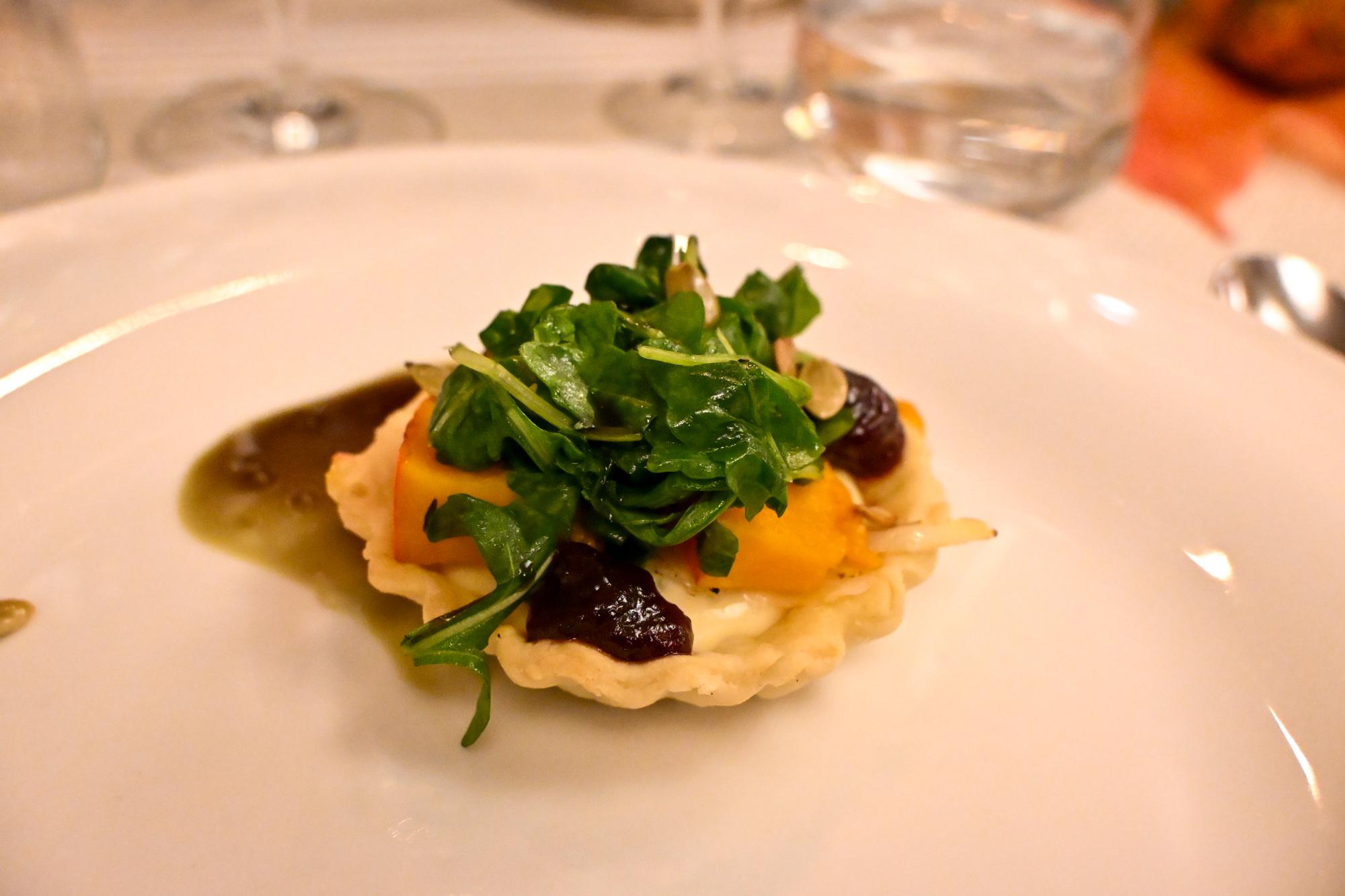 Küchenleitung Conny Ruf begrüßte die Anwesenden herzlich und wünschte allen einen genussvollen Abend. Schon der erste Gang, eine Ziegenkäse-Crème brûlée Tarte mit mariniertem Kürbis, Rucolasalat und Preiselbeerenreduktion, begeisterte mit seiner raffinierten Kombination aus herzhaften und fruchtigen Aromen.