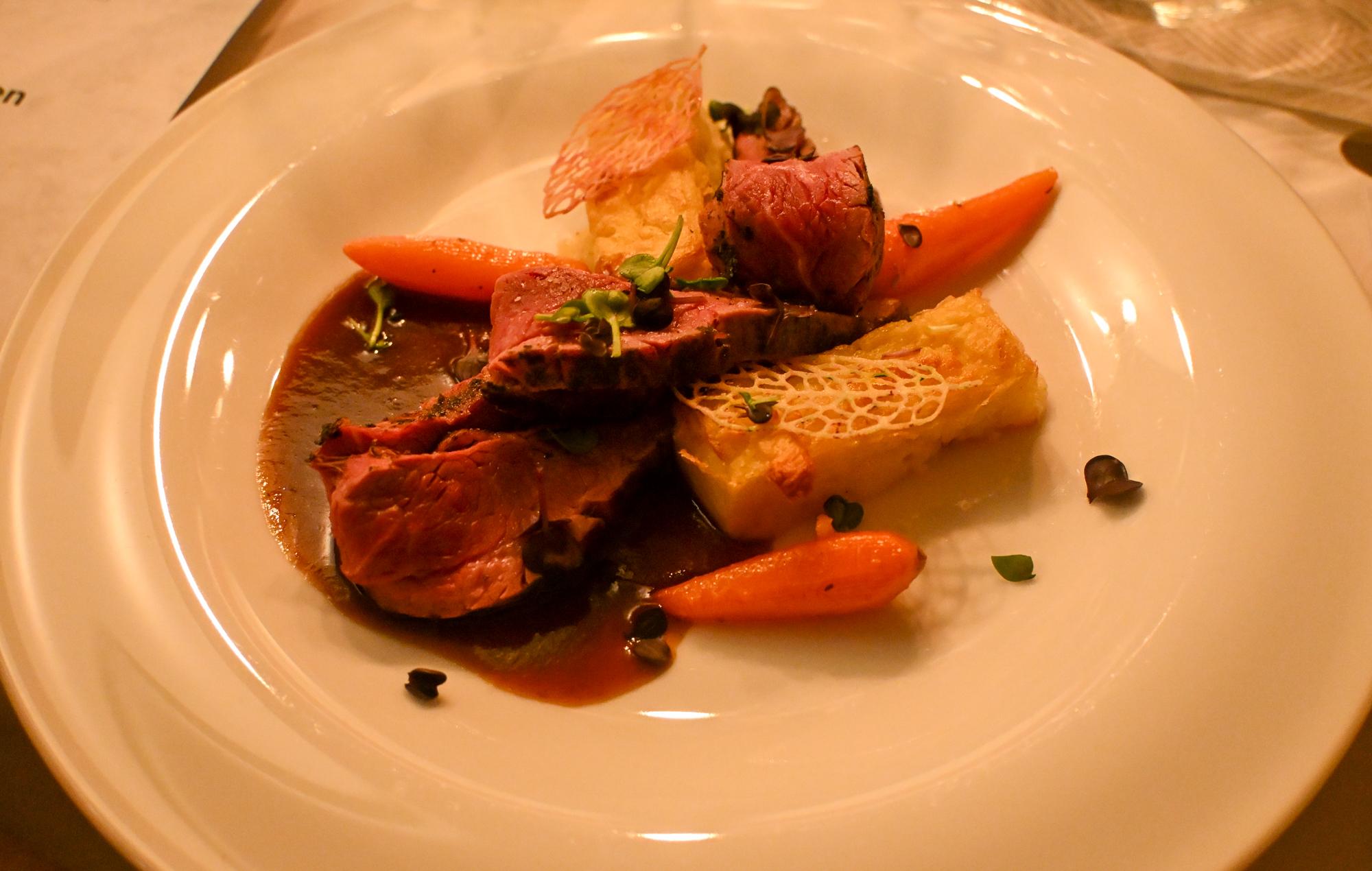Zum Hauptgang gab es Bio-Rindfleisch von der vorgestellten Erzeugergemeinschaft - ein abgehangenes Rinder-Flanksteak mit Kräuterkruste in eigenem Jus und Portweinreduktion, begleitet von glasierten jungen Karotten und Kartoffel-Fondant. Dieses überzeugte mit perfektem Gargrad, intensiven Aromen und harmonischer Präsentation. Den süßen Abschluss bildete ein Zartbitter-Schokoladenmousse auf Lebkuchen-Crumble mit Birnen-Coulis – eine feine Komposition, die die Geschmacksvielfalt des Menüs wunderbar abrundete. Die Birnen stammten von den Streuobstwiesen von Simon Rauch.