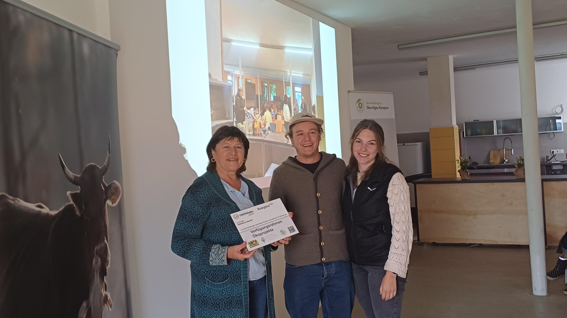 Christine Rietzler (stellv. Landrätin) überreicht das Förderschild für das Kleinprojekt von Familie Jörg