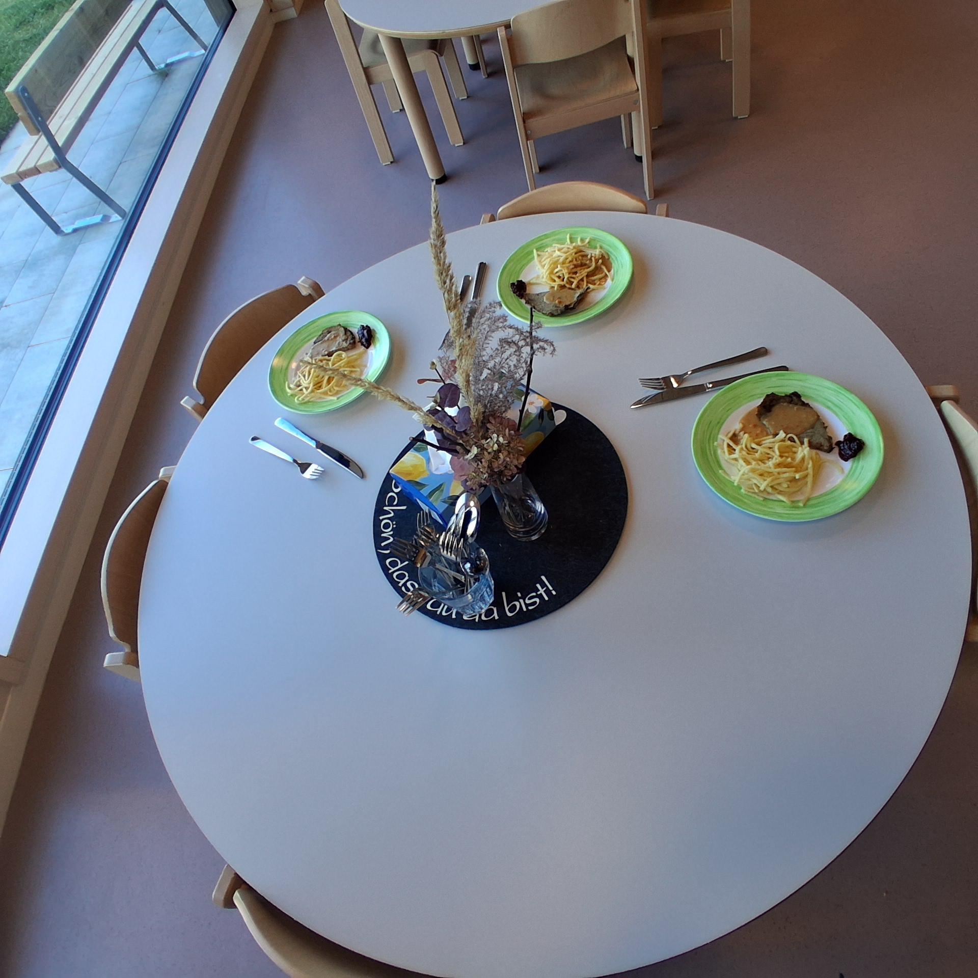 Im weiteren Gespräch erfahren wir, dass die Verpflegung für den ganzen Tag hier vom Kinderhaus angeboten wird. Auf die Nachfrage hin, ob das von den Eltern angenommen wurde, konnte Frau Bloßfeldt freudig mitteilen, dass das anfängliche Misstrauen schnell in positive Akzeptanz umschwang. So gibt es im Kinderhaus eine eigene Küche mit einer ganz tollen Köchin. Sie durften wir an diesem Tag auch begrüßen und kennenlernen und wir wurden zum Mittag eingeladen. Rindersauerbraten mit Spätzle und Soße. LECKER! Jeden Tag wird frisch gekocht! Die benötigten Lebensmittel werden aus der Region bezogen und von einem Großhändler. Das ist natürlich für die ÖMR interessant.