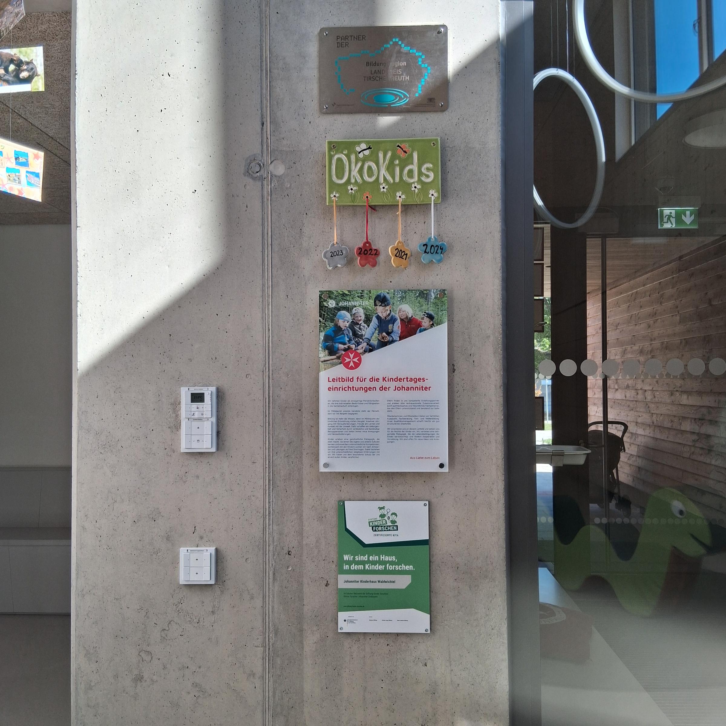 Ganz am Ende des Stationsweges in Waldsassen, da hört die Siedlung auf und der Wald fängt fast an, da steht ein ganz modernes, einladendes mit viel Holz versehenes Bauobjekt. Das Johanniter-Kinderhaus. Der Name Waldwichtel konnte nicht passender getroffen werden. Verläuft doch der Stationsweg direkt in den fast angrenzenden Wald hinein. Als ich den Eingangsbereich betrete, fühle ich mich gleich wohl. Ruhig, hell, freundlich und kindgerecht mit viel Platz zum toben. Begrüßt werde ich von Katja Bloßfeldt, sie ist die Leiterin des Kinderhauses. Gemeinsam mit Bernd Sommer, 1. Bürgermeister der Stadt Waldsassen, haben wir einen Vor-Ort-Termin, einmal um den Kindergarten zu bestaunen und kennenzulernen, des Weiteren um mögliche Unterstützung durch die Öko-Modellregion Stiftland zu sondieren.
