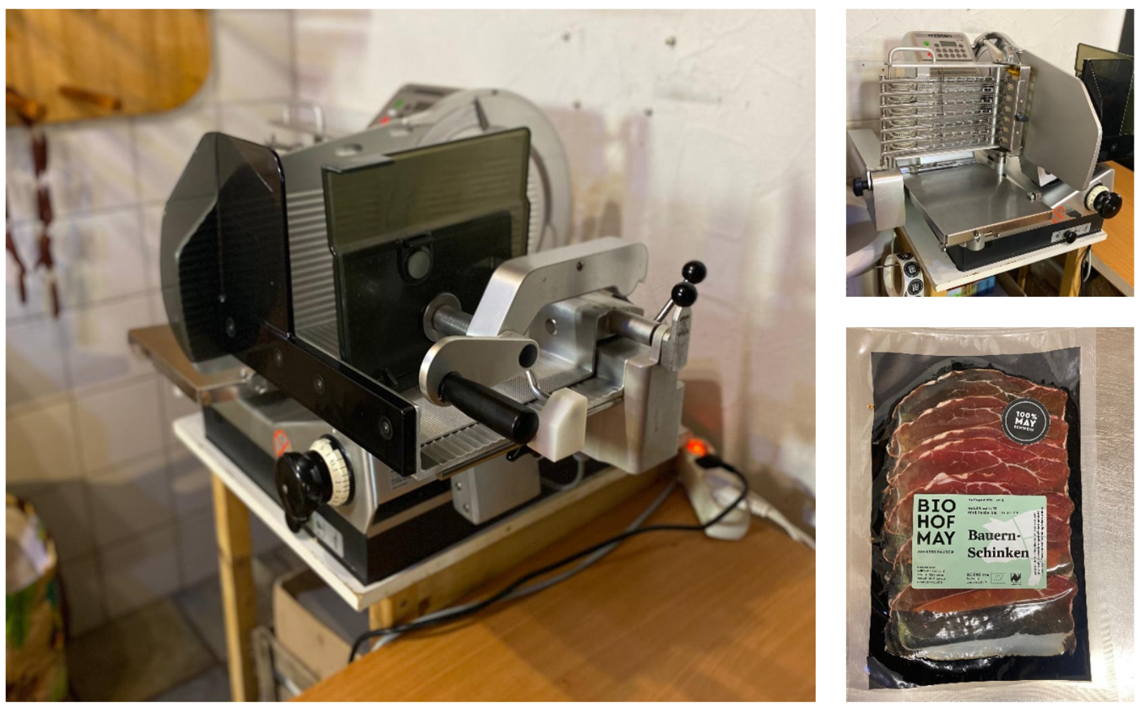 Familie May möchte eine höhere Anzahl ihrer Schweine in Rhön-Grabfeld verkaufen bzw. mehr Kundinnen und Kunden in der Region gewinnen. Da der Bedarf an küchenfertigen Produkten – besonders in der Gastronomie – steigt, hat der Biohof eine vollautomatische Aufschnittmaschine mit Ablagefunktion angeschafft. Diese erleichtert die bedarfsgerechte Vorbereitung und Verpackung der hofeigenen Produkte.