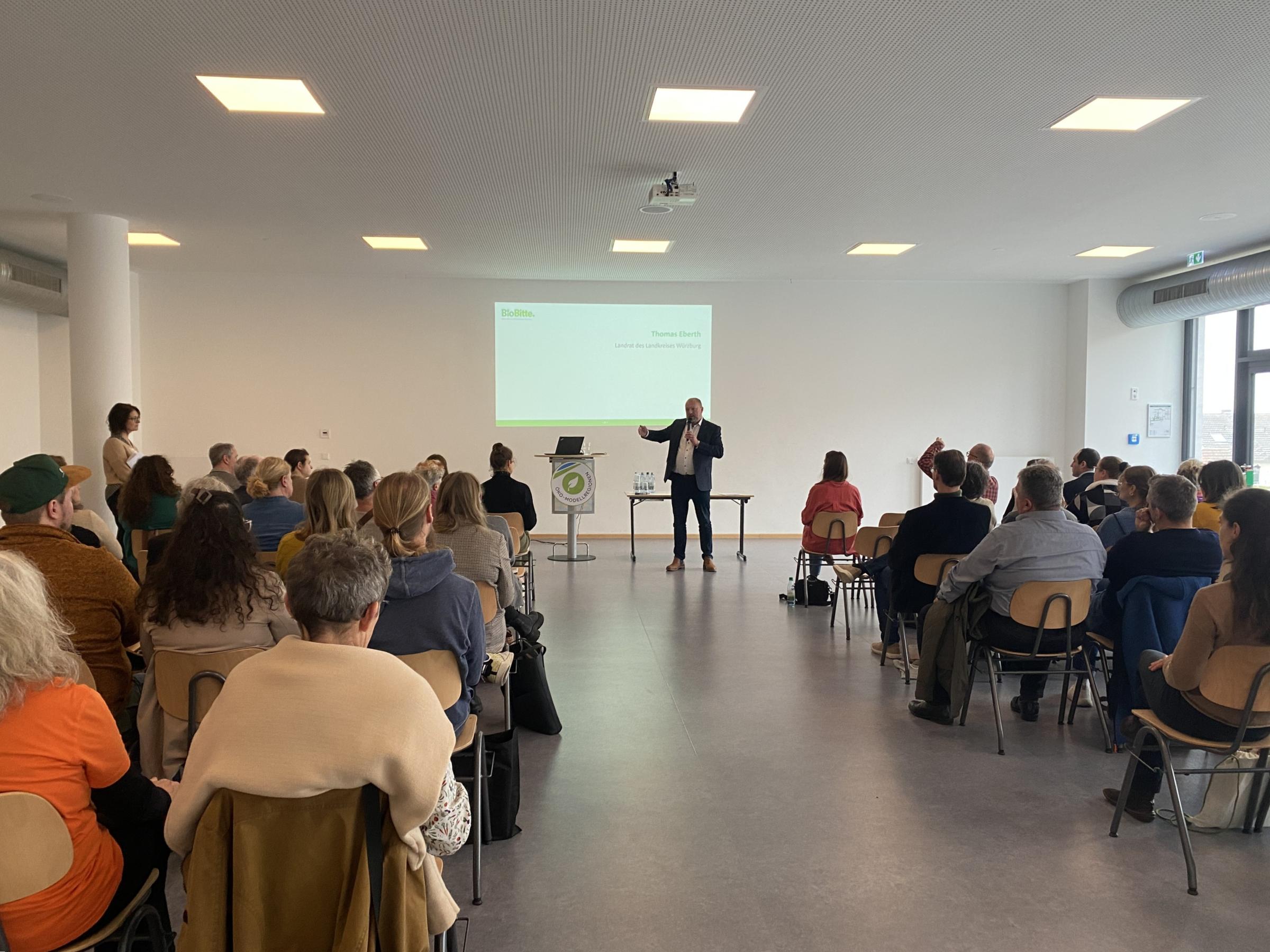Die Veranstaltung begann mit einem Fokus auf die Herausforderungen der Bio-Regionalität in der Gemeinschaftsverpflegung. Karsten Bessai, Bio-Koch und Berater, verdeutlichte eindrucksvoll, dass Nachhaltigkeit zunehmend an Bedeutung gewinnt und ein zentraler Faktor in der Außer-Haus-Verpflegung ist. Besonders hob er hervor, dass durch die Reduzierung von Lebensmittelabfällen nicht nur ökologische Vorteile entstehen, sondern auch erhebliche finanzielle Einsparungen möglich sind. „Das ist ein spannender und guter Ansatz, um Geld und Ressourcen zu sparen, um diese dann in qualitativ hochwertigere Produkte zu stecken“, kommentierte Landrat Thomas Eberth und unterstrich damit die doppelte Wirkung nachhaltiger Maßnahmen.