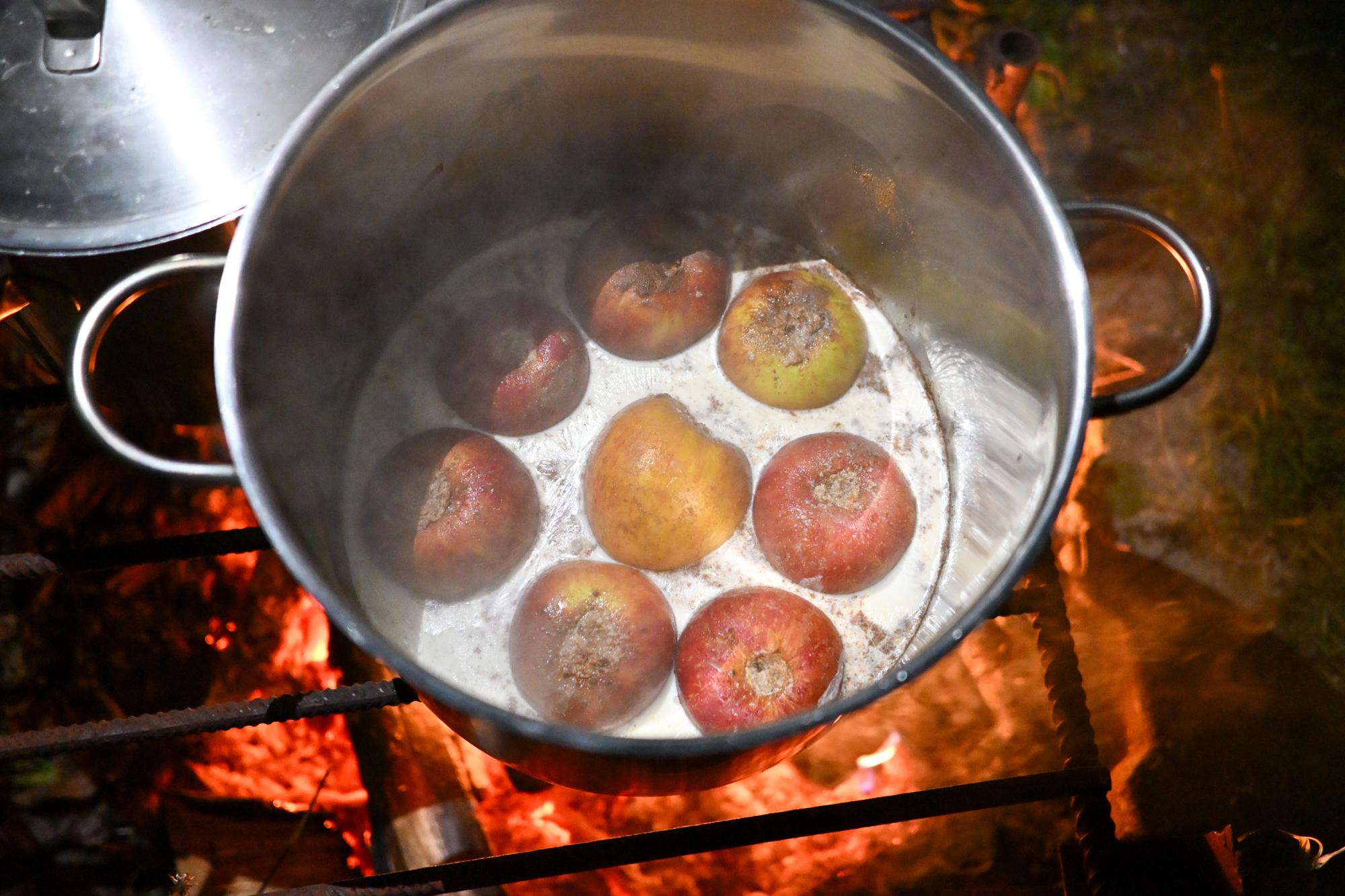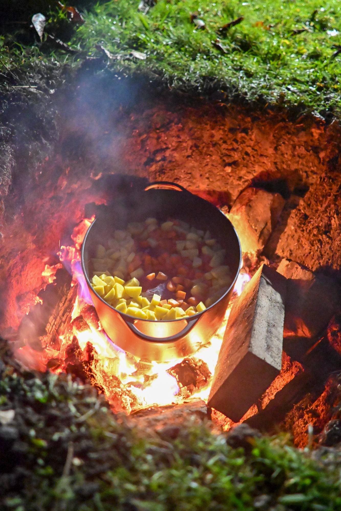 Auf dem Programm standen eine herzhafte Linsensuppe als Vorspeise, gefolgt von einem Bio-Rinderbraten mit saisonalem Gemüse als Hauptgang. Zum Abschluss gab es köstliche Bratäpfel als Dessert. Besonders spannend für die Teilnehmer war der Moment, in dem der Topf aus dem Feuerloch wieder ausgegraben wurde – das Ergebnis überzeugte alle: Die Gerichte schmeckten hervorragend und sorgten für rundum zufriedene Gesichter.