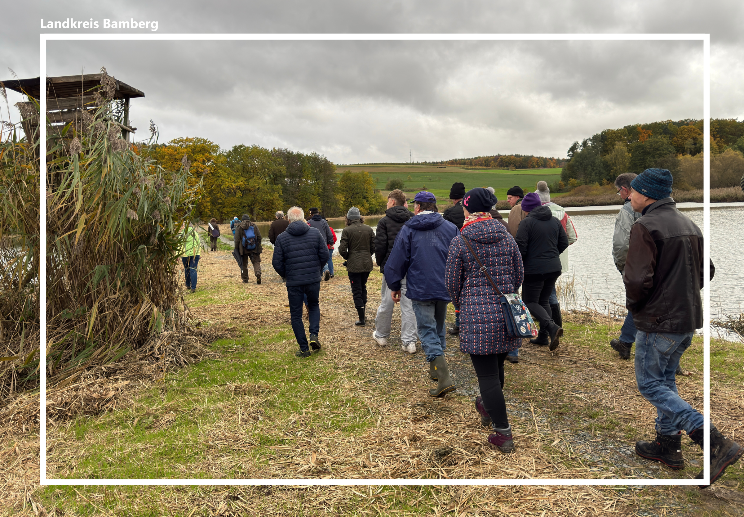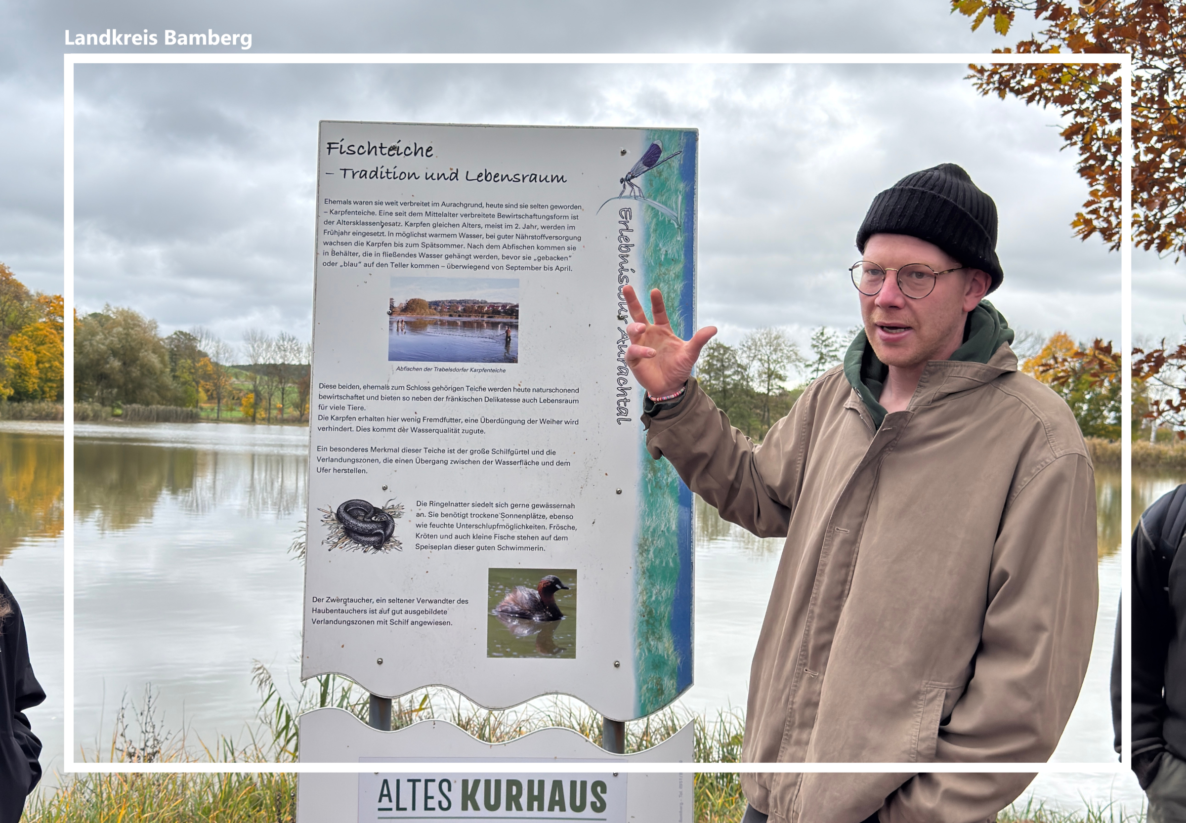 Unter der Leitung von Naturpark-Rangerin Verena Kritikos und Fischwirt Louis Grimmer führte ein etwa zwei Kilometer langer Rundgang durch die Weiherlandschaft. An mehreren Stationen ging es um die verschiedenen Aspekte der Teichwirtschaft. Louis Grimmer erklärte die Abläufe vom kleinen Setzlingsfisch bis zum dreijährigen Karpfen in der Vermarktungsphase und gab Einblicke in seine tägliche Arbeit mit den nachhaltigen Fischen. Verena Kritikos beleuchtete die Bedeutung der Teiche in der Kulturlandschaft – als Lebensraum, für Wasserrückhalt sowie für Naherholung und Tourismus.