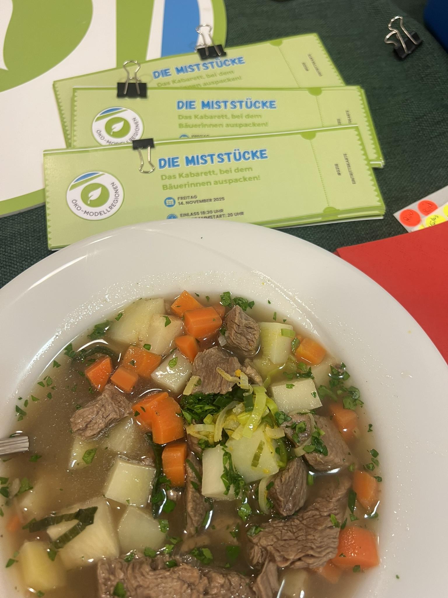 Vor Veranstaltungsbeginn konnten die Gäste zwei bio-regionale Gerichte genießen, die vom Stürzer Catering aus Egmating frisch zubereitet wurden. Das Angebot wurde sehr gut angenommen und trug zu einer warmen, gemeinschaftlichen Atmosphäre bereits vor Aufführungsbeginn bei.