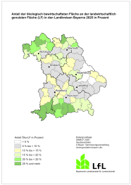 Ende 2024 gab es in Bayern 11071 Betriebe mit einer Ökolandbau-Fläche von 418068ha. Ende 2022 gab es "nur" 10550 Betriebe und eine Fläche von 398729ha. Dies macht ein Plus von ca. 4,94% bei der Betriebsanzahl und ca. 4,85% bei der Fläche.