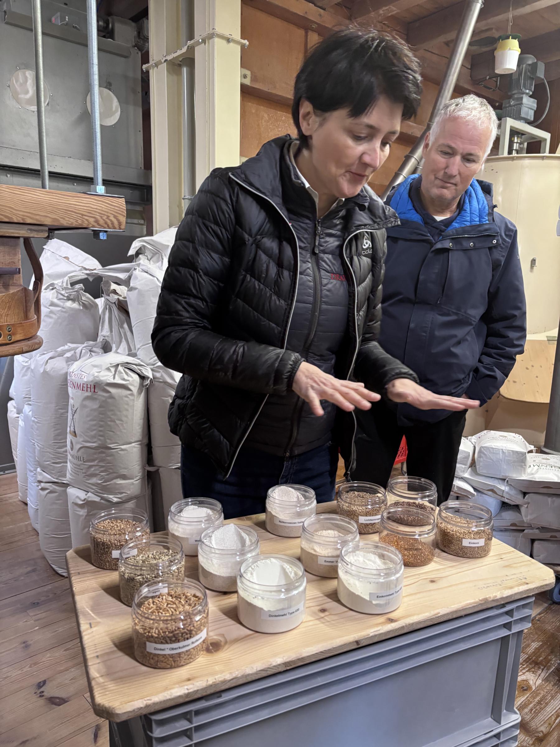 Die Drax-Mühle, die seit mehreren Generationen von der Familie Drax geführt wird, gehört zu den ältesten Mühlen im süddeutschen Raum. Bereits 1534 urkundlich erwähnt, ist sie heute ein hochmoderner Mühlenbetrieb, der ausschließlich Getreide aus der Region verarbeitet und dabei eng mit regionalen Bio-Landwirtinnen und Landwirten zusammenarbeitet. Inhaberin Monika Drax führte die Teilnehmenden durch Ihren Betrieb und gab spannende Einblicke in die Historie, die technische Entwicklung und die Philosophie der Mühle: „Wir verarbeiten hier das, was in unserer Region wächst – nachhaltig, hochwertig und mit größter Sorgfalt.“