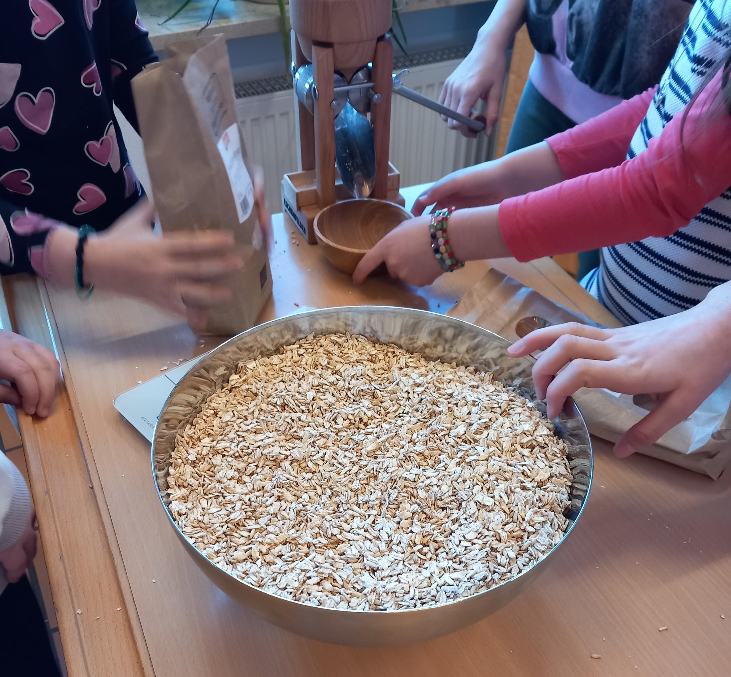 Beim letzten Termin im Januar quetschte die Klasse 4a unter Anleitung von Dr. Christina Lichtmannegger-Nowak von der Ökomodellregion Waginger See – Rupertiwinkel regionale Bio-Haferkörner zu Flocken.