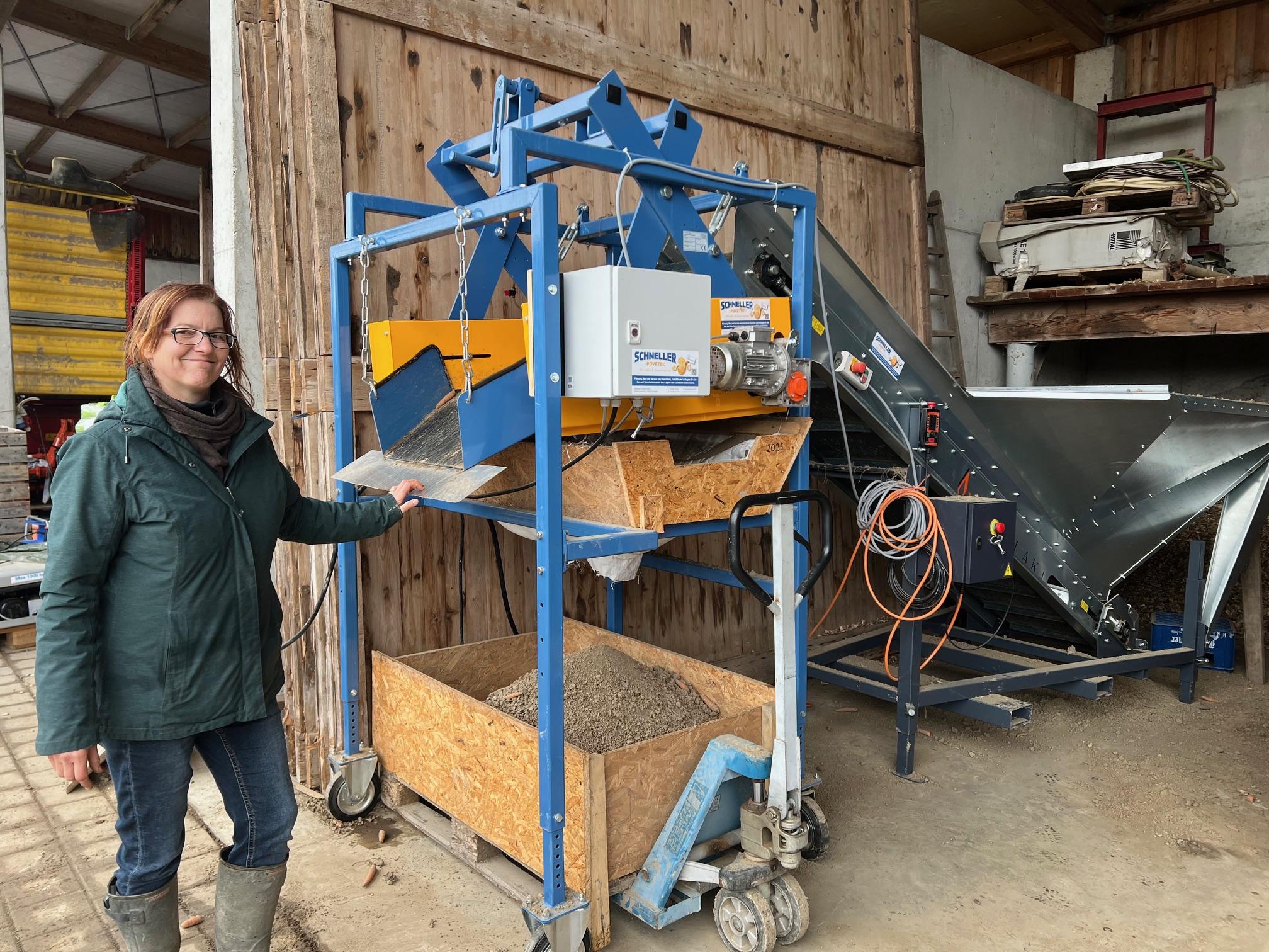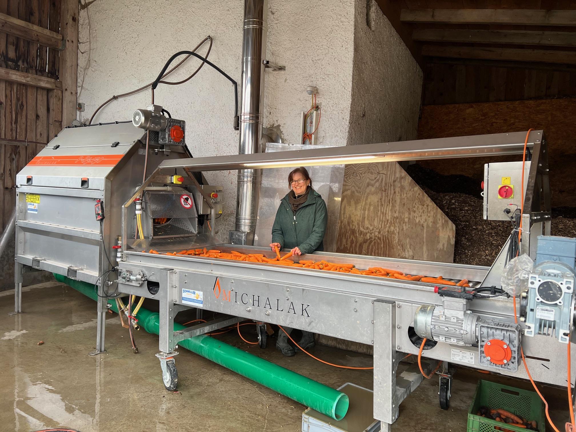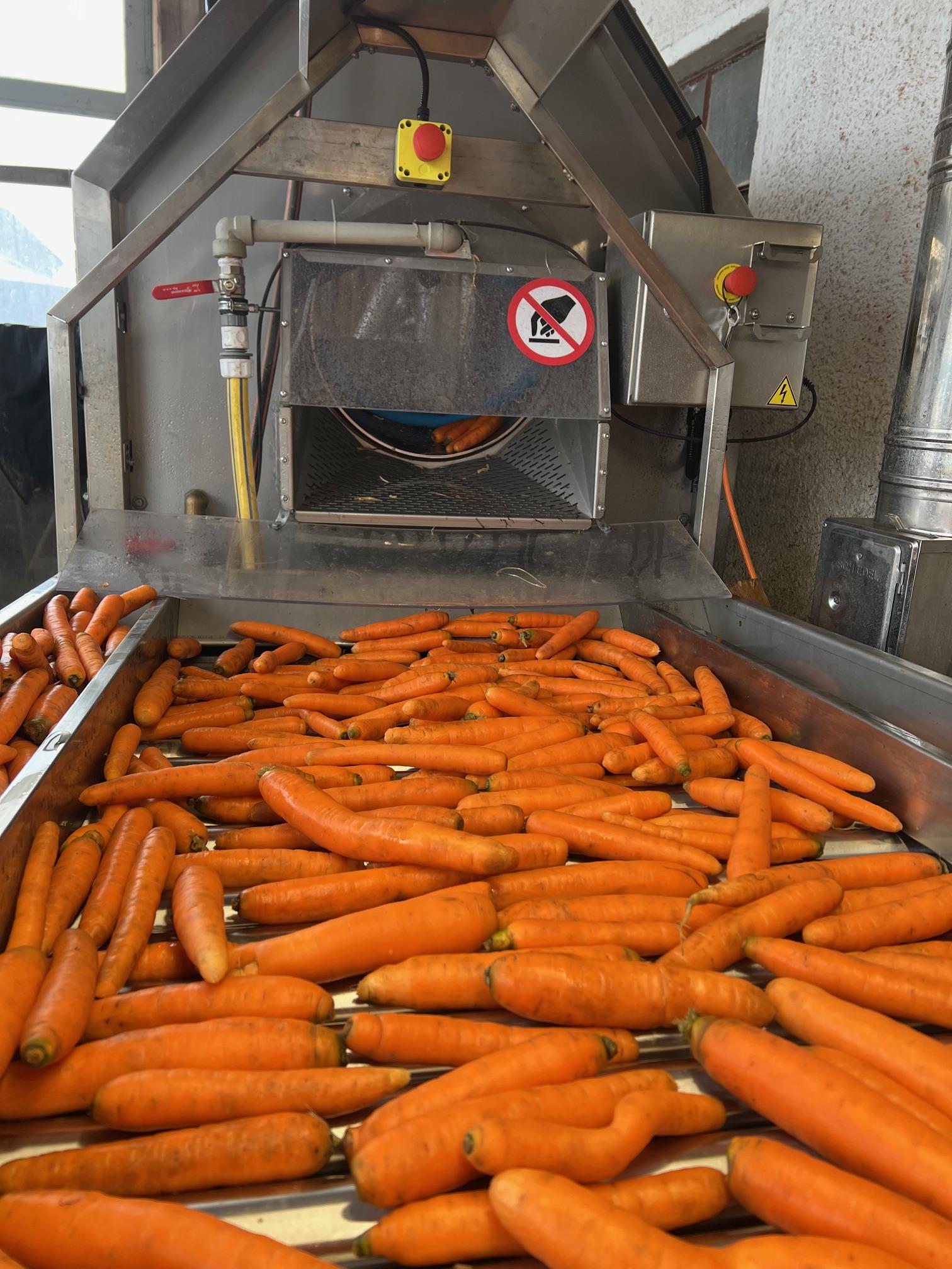Mit dem Gabelstapler wird das Gemüse aus der Kiste in den Einfülltrichter gekippt und von Erde befreit. Dann wird es in der Trommel gewaschen und auf dem Förderband sortiert.