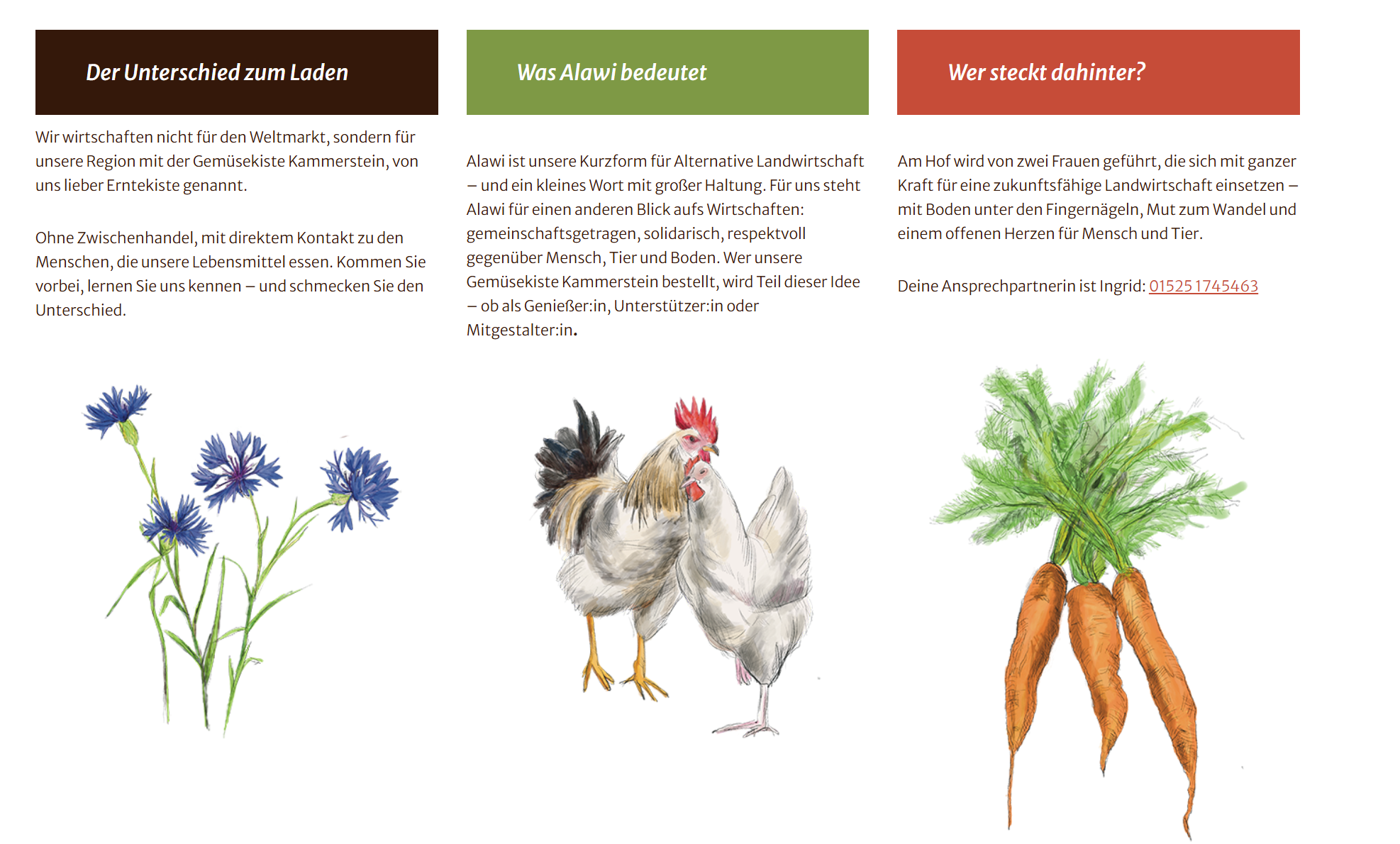 Die Alternative Landwirtschaft Alawi GmbH in Poppenreuth bei Kammerstein ist ein kleiner, ökologisch ausgerichteter Landwirtschaftsbetrieb, der sich auf gemeinschaftsgetragenen Gemüsebau und nachhaltige Bewirtschaftung spezialisiert hat. Der Hof verbindet biologische Landwirtschaft mit sozialen Projekten und ermöglicht es Menschen, als Ernteteiler*innen Teil der saisonalen Gemüseproduktion zu werden. Im Kleinprojekt wurden Mittel für den Aufbau einer Internetplattform zur Verfügung stellt, mit den folgenden 3 Bausteinen: