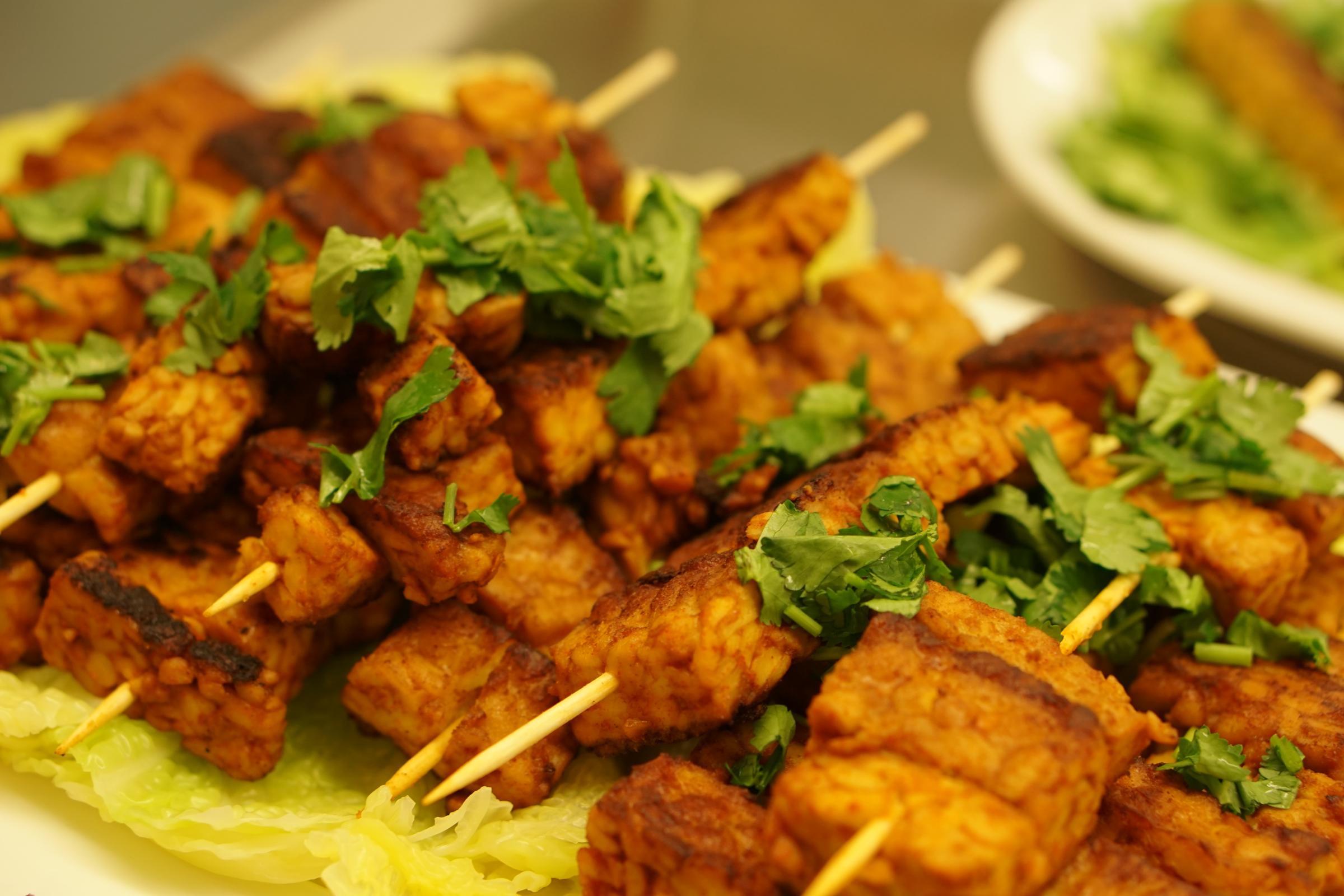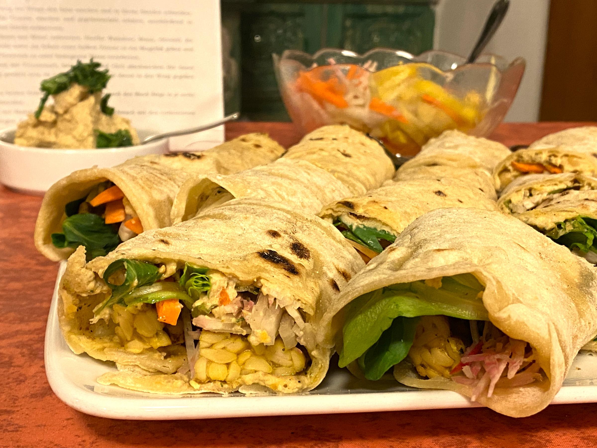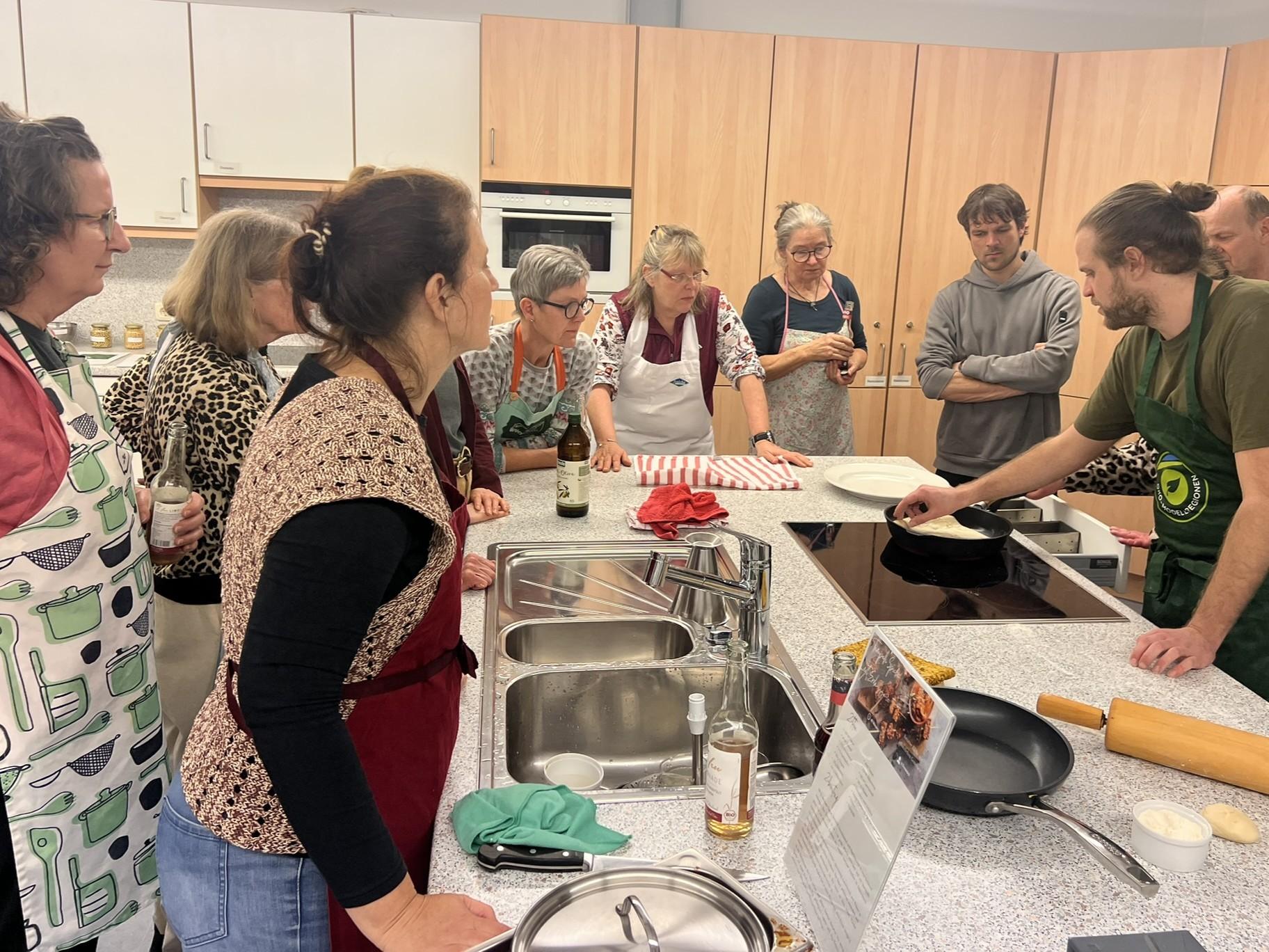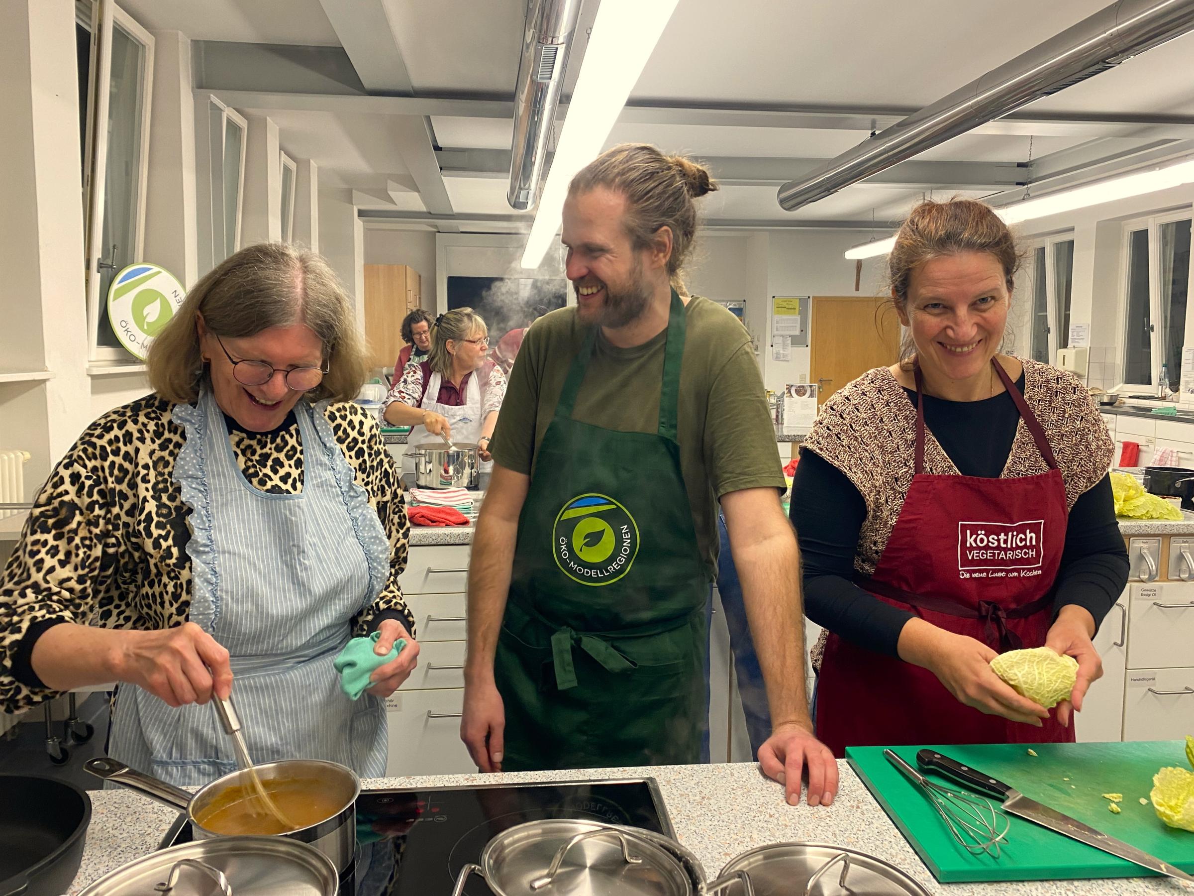 In der Küche der Hauswirtschaftsschule Bischofsheim herrschte ein buntes Treiben aus Schnippeln, Kneten, Braten und Würzen. Denn die Öko-Modellregion Rhön-Grabfeld hatte zum bio-regionalen Kochworkshop eingeladen. Auf dem Speiseplan standen neben saisonalem Bio-Gemüse wie Karotten, Feldsalat, Wirsing und Grünkohl Bio-Tempeh und Bio-Seitan aus der Region. Jonas Waibl von Vagabohne erklärte, wie er aus Sojabohnen Tempeh und aus Weizenprotein Seitan herstellt und gab Tipps zu den Rezepten. Mit bunten bio-regionalen Zutaten zauberten die Hobby-Köchinnen und -Köche eine Extraportion Eiweiß mit viel Geschmack in den Kochtopf. Auf dem Büfett richteten sie Wraps mit selbstgemachten Chapati, Hummus und Tempeh sowie eine frische Grünkohlsuppe mit Seitan, ein vegetarisches Szegediner Gulasch und Tempeh-Spieße mit Erdnusssoße an. Und zum Nachtisch ließen sich die Teilnehmenden eine Mousse au Chocolat aus Seidentofu und fairer Bio-Schokolade schmecken. Wer die Gerichte nachkochen möchte, findet alle Rezepte am Ende des Artikels zum Download.