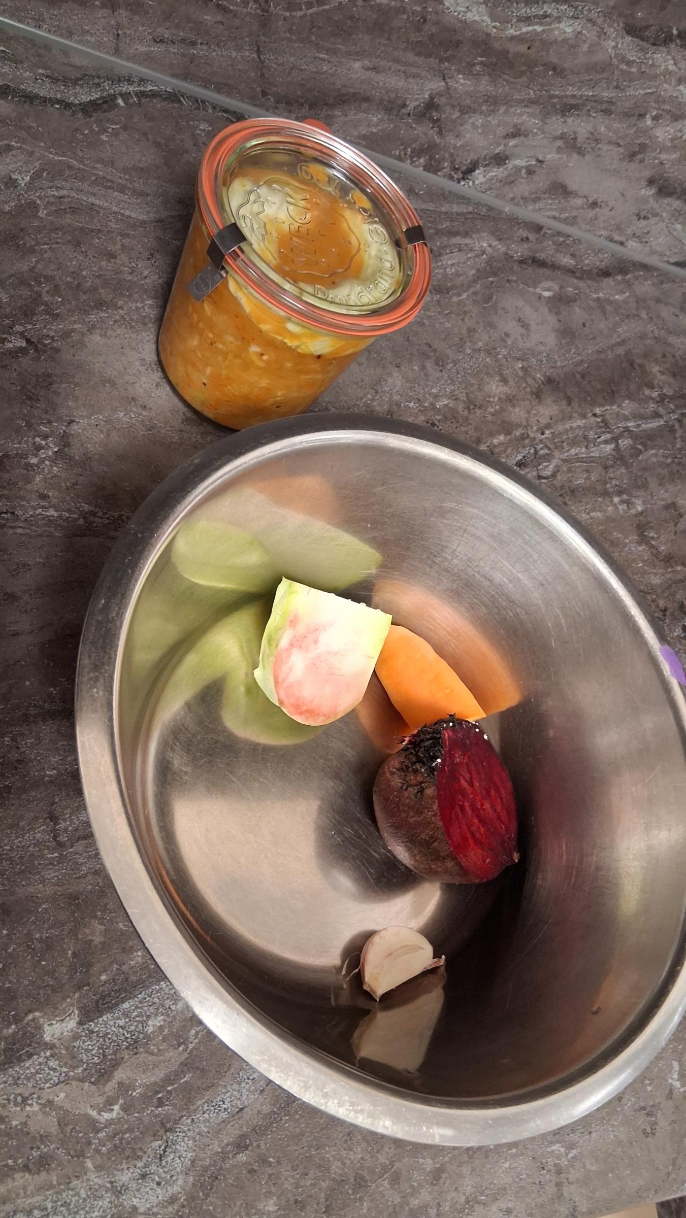 Gemüse, ein scharfes Messer oder Hobel, eine Waage, eine Schüssel,ein Glas mit Deckel, Gewürze und Geduld.