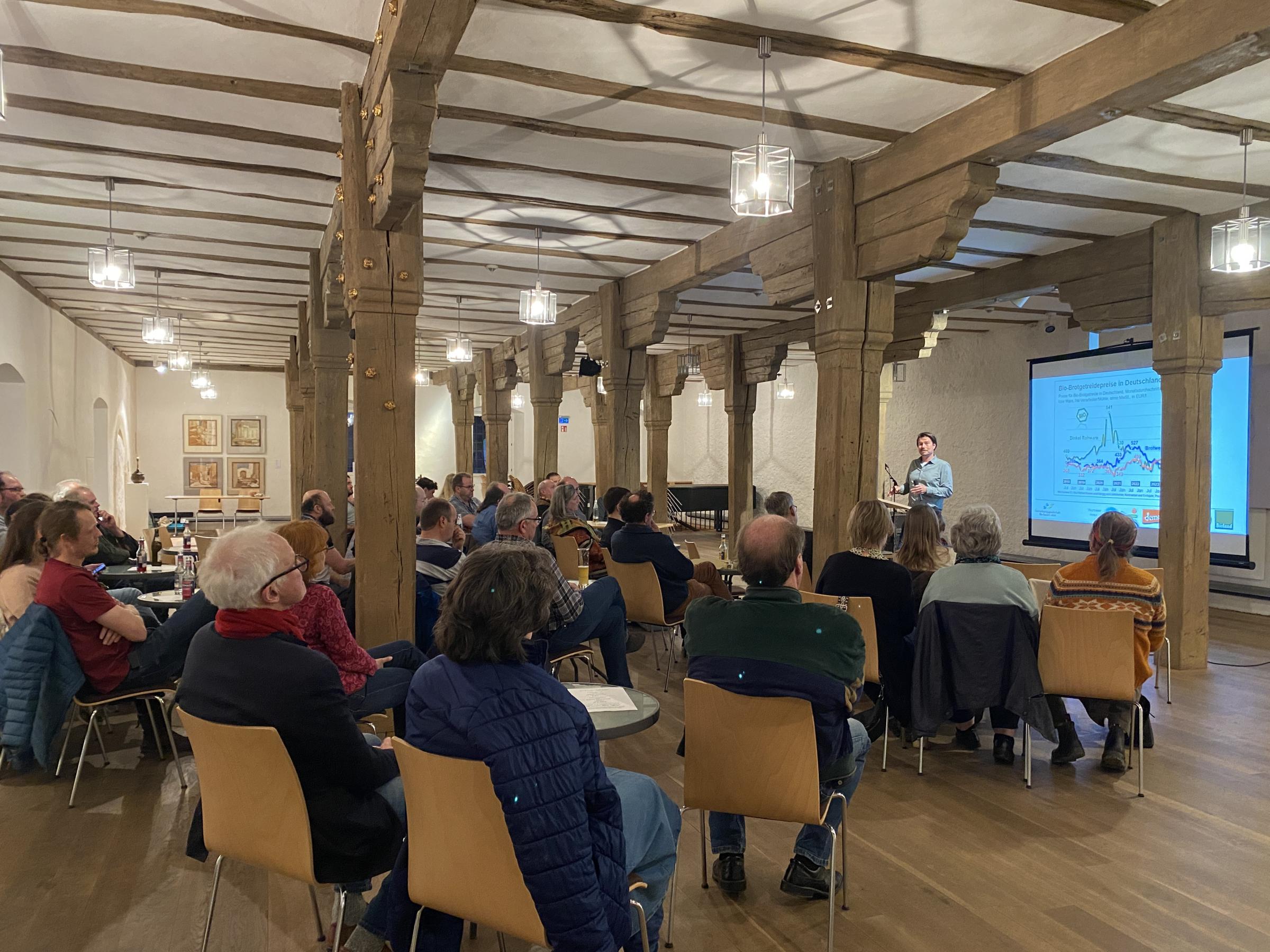 Am Ende des Vortrags wurde die zentrale Zukunftsfrage diskutiert: Welche Strategien sind für Bio-Betriebe sinnvoll? Direktvermarktung in der Region oder die Zusammenarbeit mit Handelspartnern? Einzelbetrieb oder Erzeugergemeinschaft? Aus dem Publikum kam die Frage, ob nicht die Politik stärker eingreifen müsse, um faire Rahmenbedingungen zu schaffen.