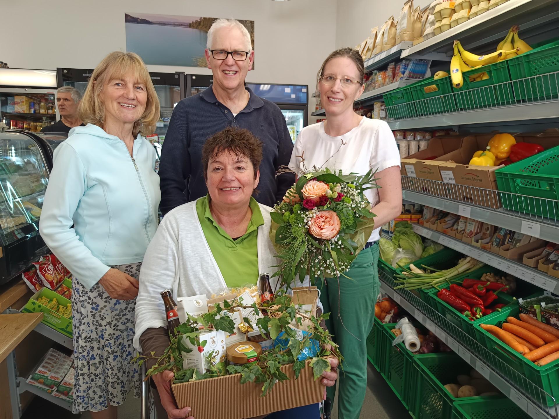 Auch Romy Mayer, Mitarbeiterin der Ökomodellregion, gratulierte herzlich zur gelungenen Renovierung und sprach die leicht veränderten Inhaberstrukturen an. Vroni Haslberger hatte den Laden bislang gemeinsam mit ihrem Sohn geführt, der jedoch ausgestiegen ist. Allein bleibt sie dennoch nicht: Künftig unterstützt sie ihr Ehemann Michael Haslberger, der in nächster Zeit in den Ruhestand geht und sich mit spürbarer Freude in den Betrieb einbringen möchte.