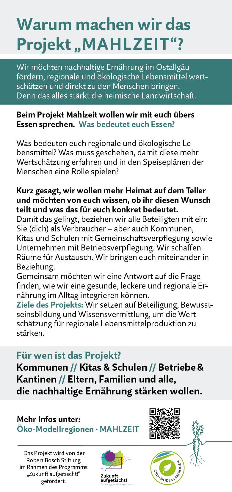 Der Landkreis Ostallgäu wurde mit seiner Projektidee „MAHLZEIT – Den Einsatz regionaler (Bio-)Produkte in Ostallgäuer Küchen stärken“ für die Förderung „Zukunft aufgetischt! Ernährung gemeinsam gestalten" ausgewählt. Gemeinsam mit zwei Vereinen, der Solawi (Solidarische Landwirtschaft) Mana Allgäu und Allgäu FairNetzt hat sich der Landkreis Ostallgäu bei der Robert Bosch Stiftung beworben. Das Ostallgäuer Projekt konnte sich dabei als einziges Projekt in ganz Süddeutschland gegen zahlreiche Mitbewerber durchsetzen. Mit einer finanziellen Unterstützung von bis zu 175.000 Euro wird in den nächsten zwei Jahren daran gearbeitet, die Vernetzung zwischen Zivilgesellschaft und Verwaltung zu stärken und gesunde, nachhaltige Ernährung in der Region zu fördern.